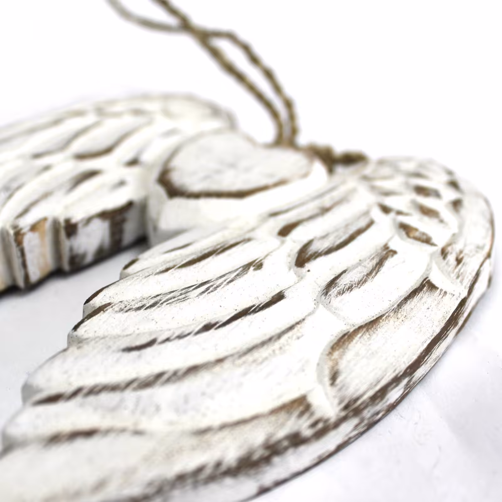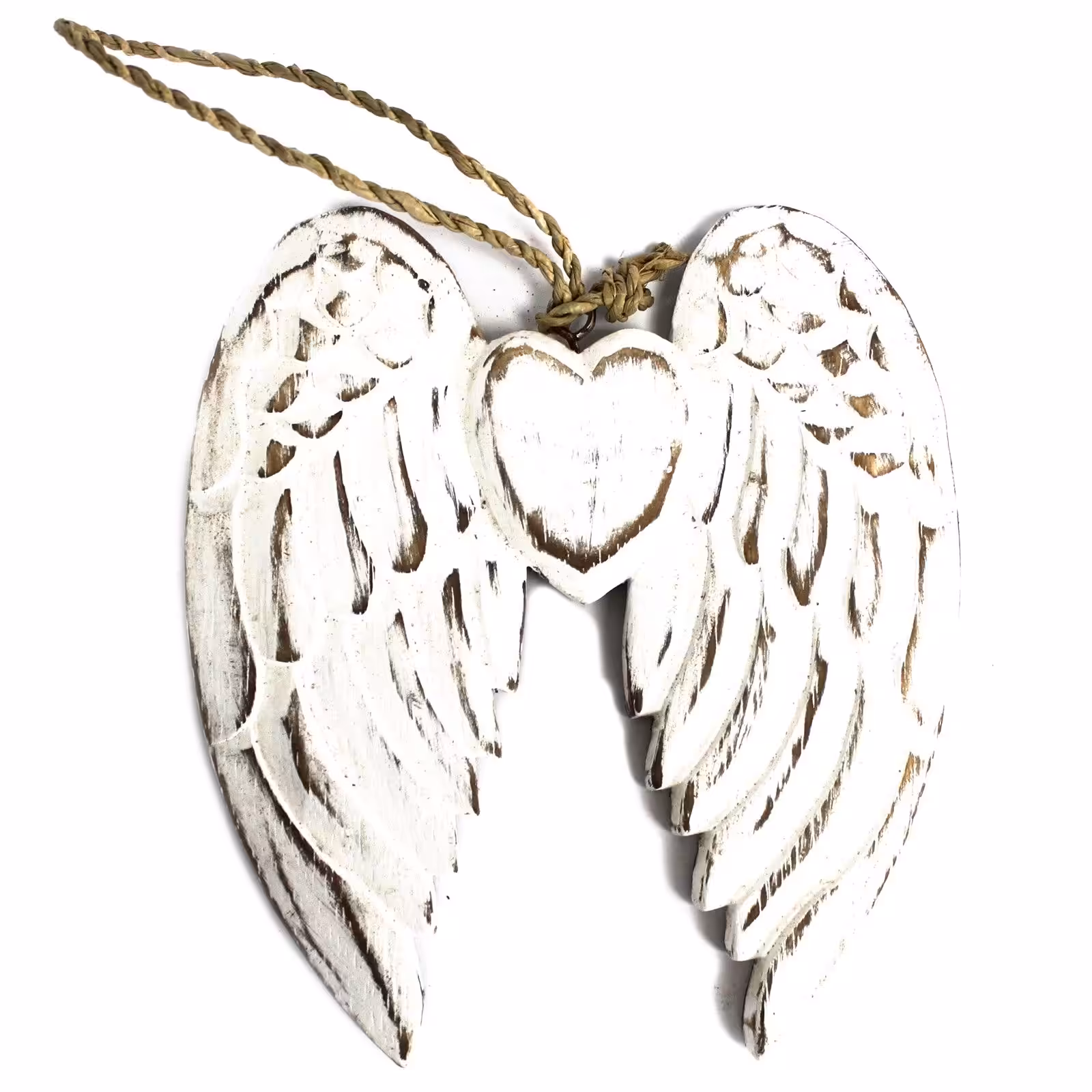 Beautiful Angel Wings.  Vintage style in distressed wood. Hand carved in Bali from sustainable albesia wood and finished in white washed process for Ancient Wisdom. Each decoration is distressed by hand giving each piece it's own uniqueness.These pretty angel wings make a lovely gift or home decoration, looking pretty hanging on a wall or door or…