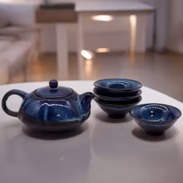 The teapot boasts a smooth, glossy blue finish with subtle, artistic gradients, creating a serene and sophisticated look. Its ergonomic handle and precisely designed spout ensure easy and smooth pouring. The set includes four matching cups with a mesmerizing blue glaze.