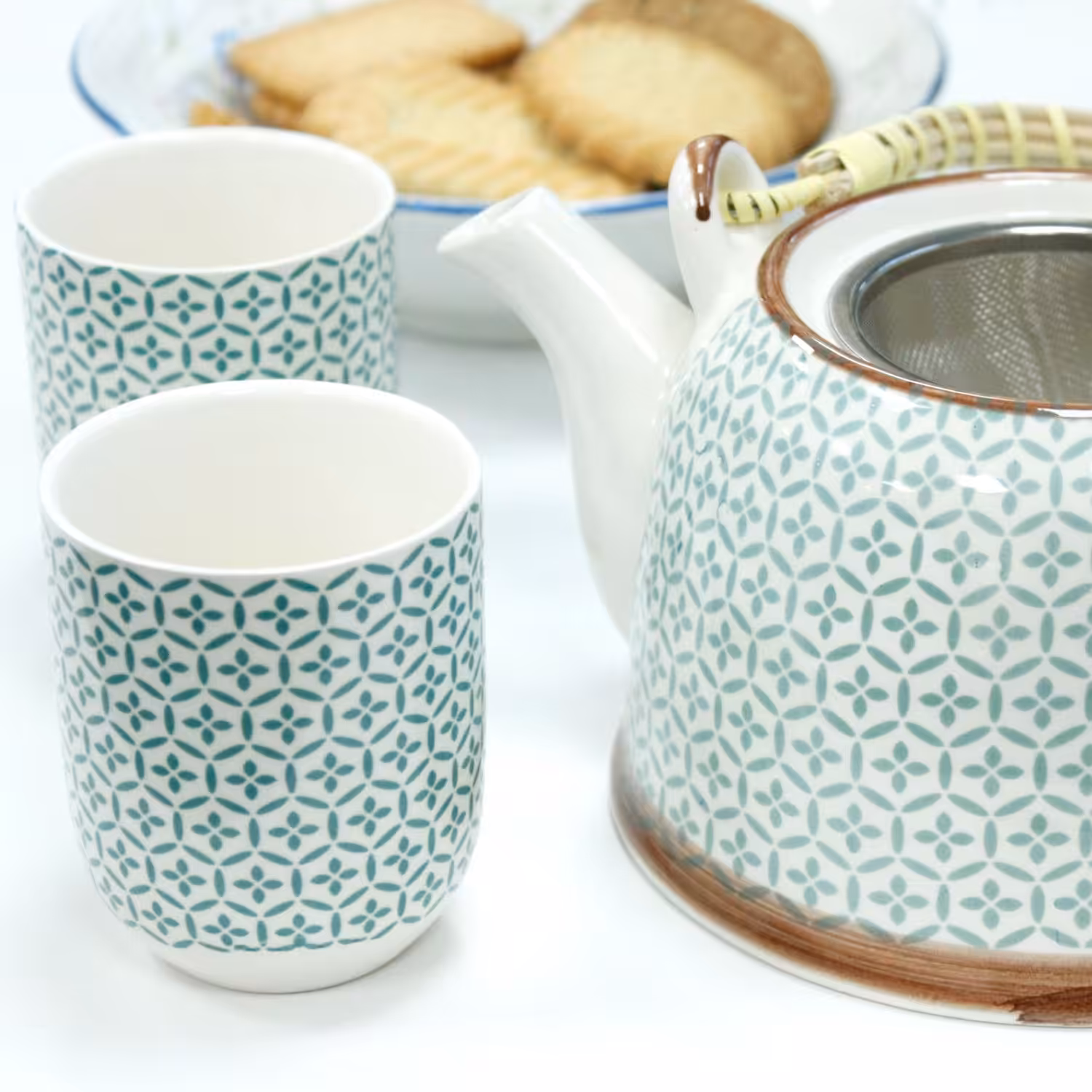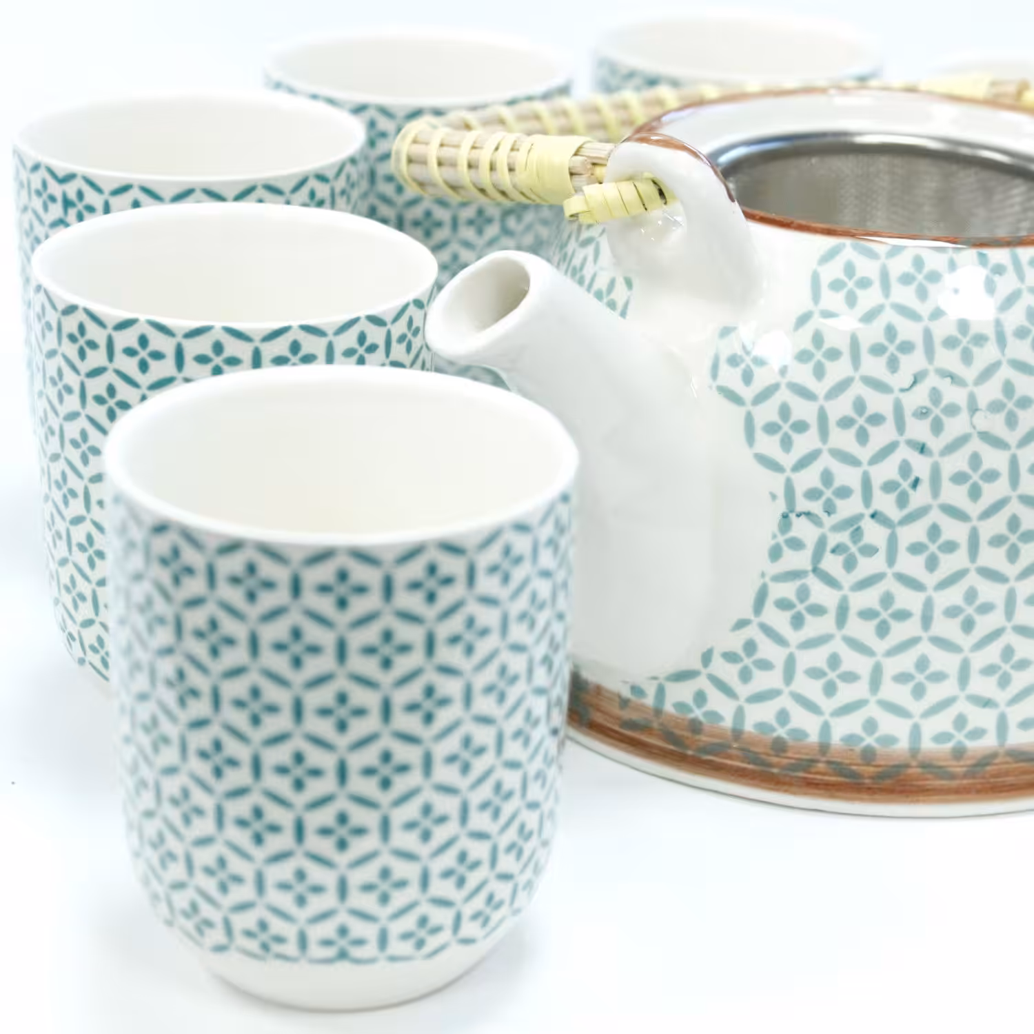 Packed in a gift box, a teapot with a metal strainer in the lid and six matching cups.