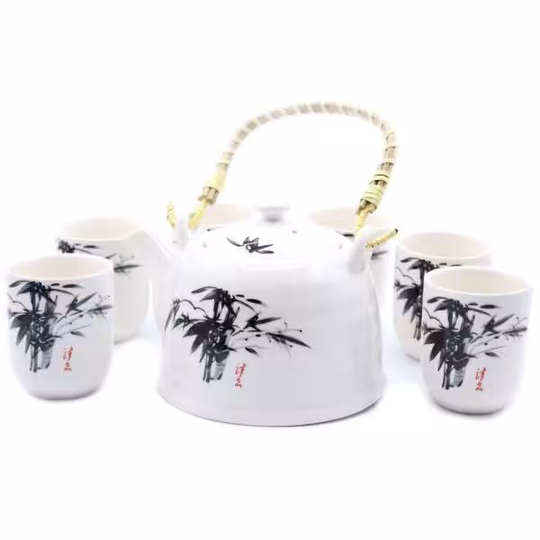 Packed in a gift box, a teapot with a metal strainer in the lid and six matching cups.