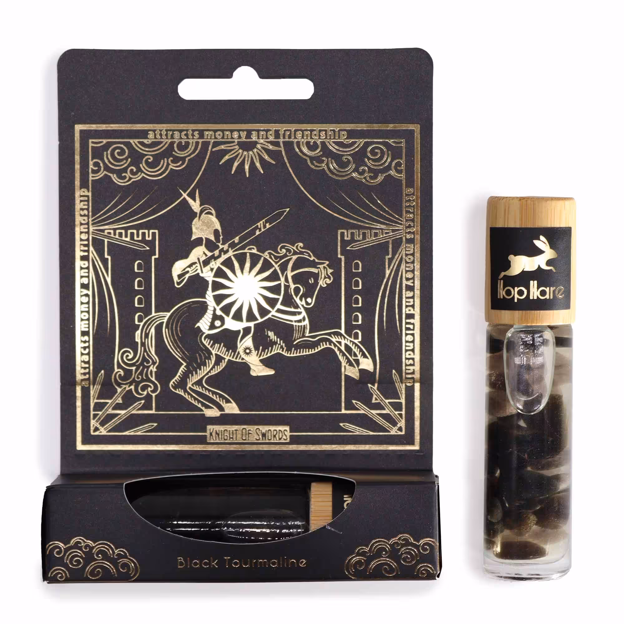 Jump on a Gallant Quest: "The Knight of Swords" by Hop Hare, an essential oil gemstone roll-on crafted for the modern-day warrior of life. Infused with the protective energy of Black Tourmaline, this blend is forged to attract prosperity and forge bonds of camaraderie.