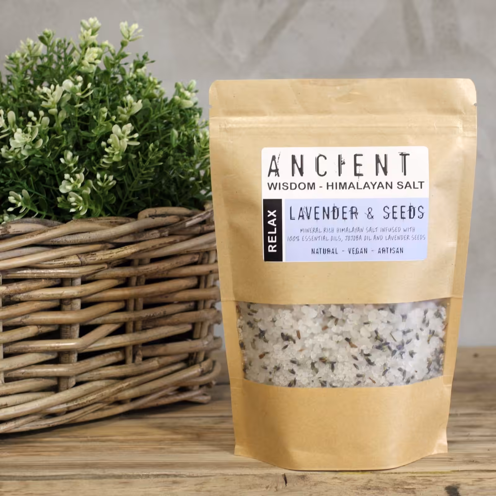 Mineral, rich Himalayan salt infused with 100% essential oils, Jojoba Oil and Lavender Seeds.
