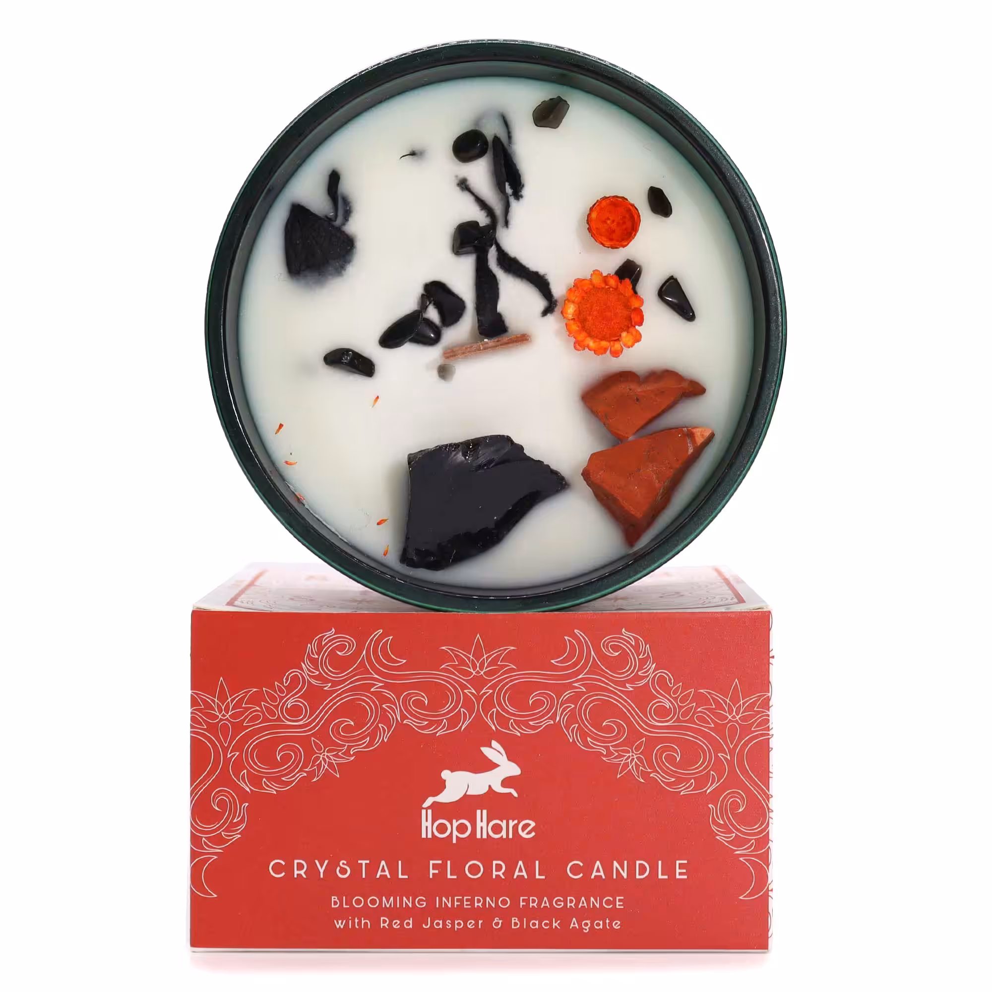 Step into the mystical world with Hop Hare Crystal Magic Flower Candle – The Devil, crafted with Red Jasper & Black Agate with the addition of dry flowers.