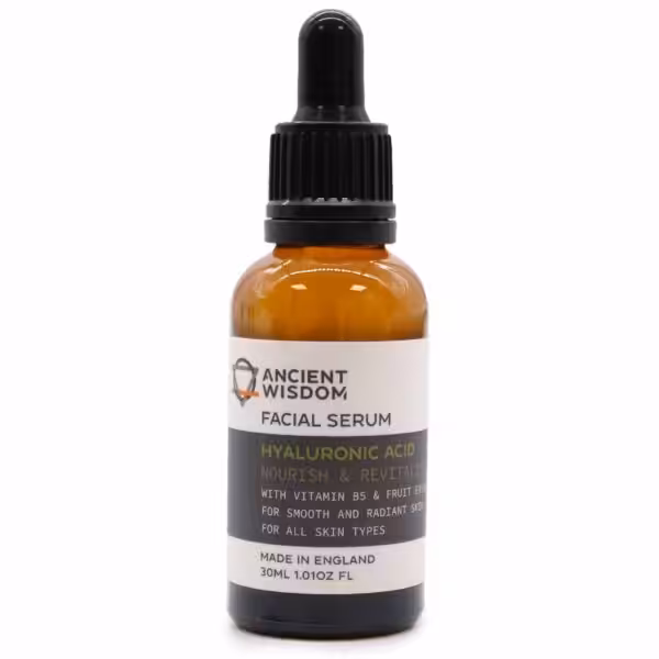 Ancient Wisdom Hyaluronic Acid Facial SerumNOURISH & REVITALISEFacial Serum with vitamin B5 and fruit extracts for smooth and radiant skin. Suitable for all skin types.-Made in the UK -Vegan Friendly
