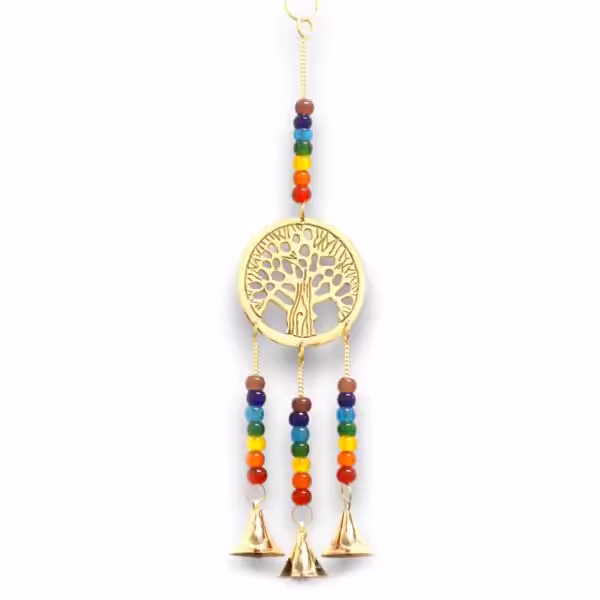 Featuring a beautifully detailed Tree of Life motif, this piece is complemented by vibrant chakra beads and three soothing brass bells. It’s a versatile décor item, ideal for meditation spaces, gardensor any home environment looking for a touch of serenity.