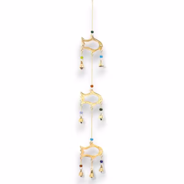 This 54 cm chime features three brass fish shapes, suspended along with colourful beads and 7 brass bells that produce soothing, melodic tones with the breeze.