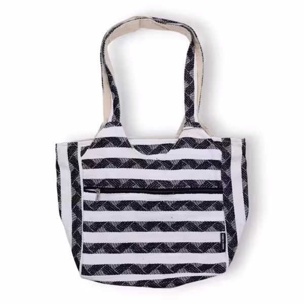 Easy-going, soft to carryand made for days when you want space without the bulk. The Wander Muse Bag blends a relaxed handmade look with practical everyday function, finished in the signature Atlas Nomad navy-and-white jacquard weave.