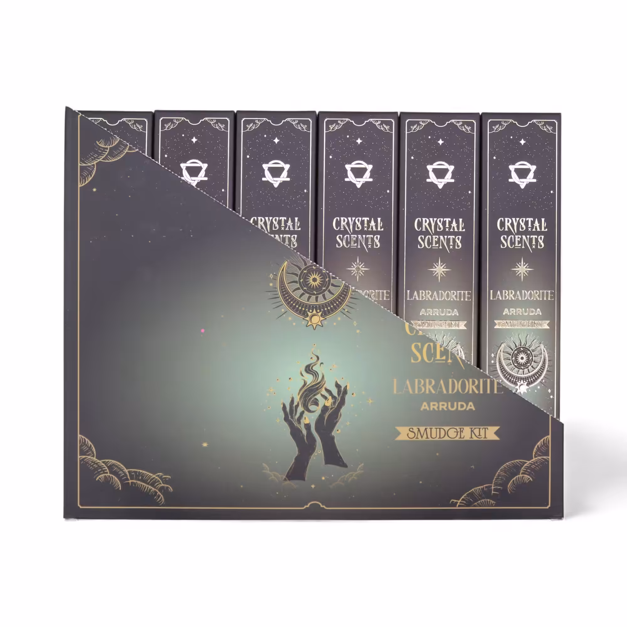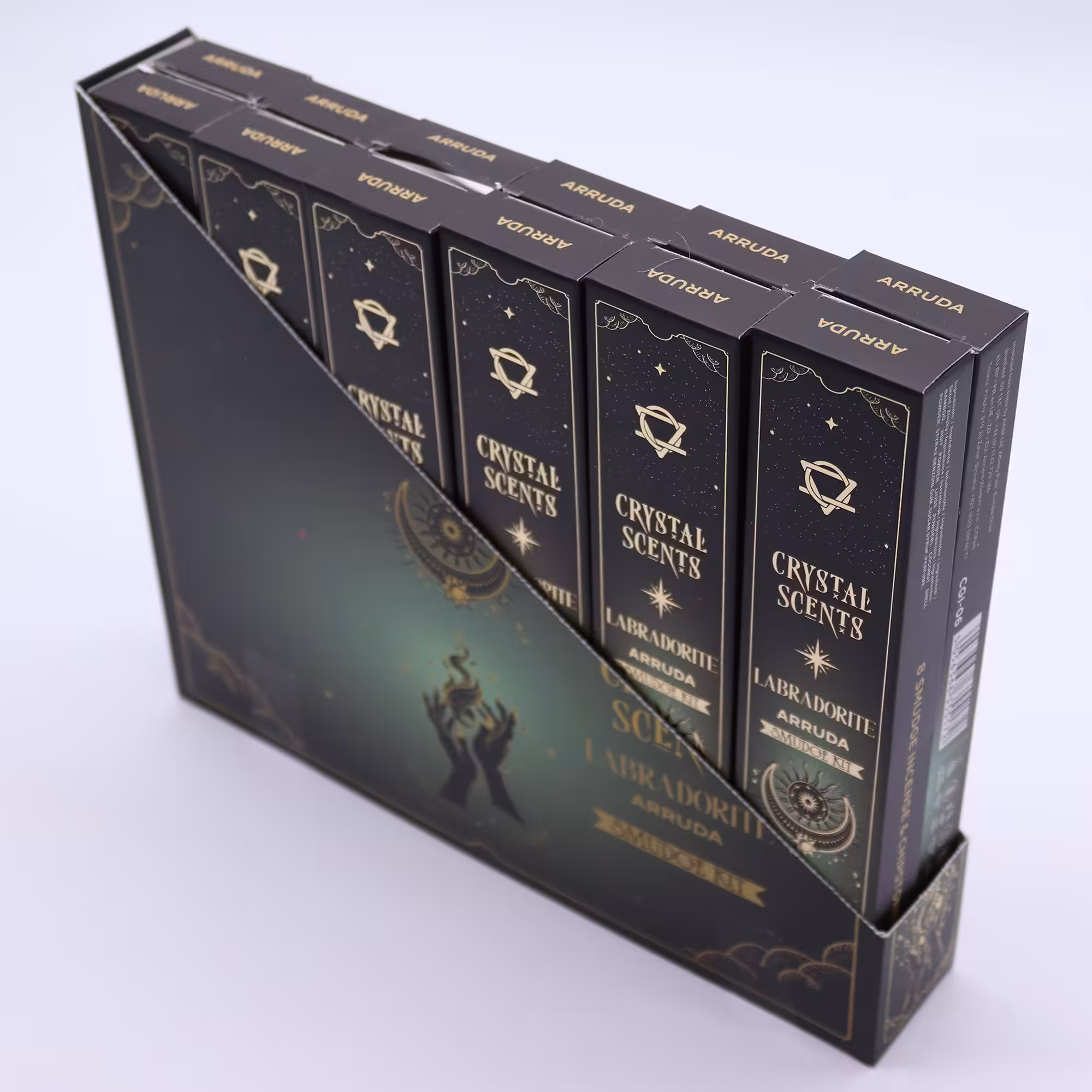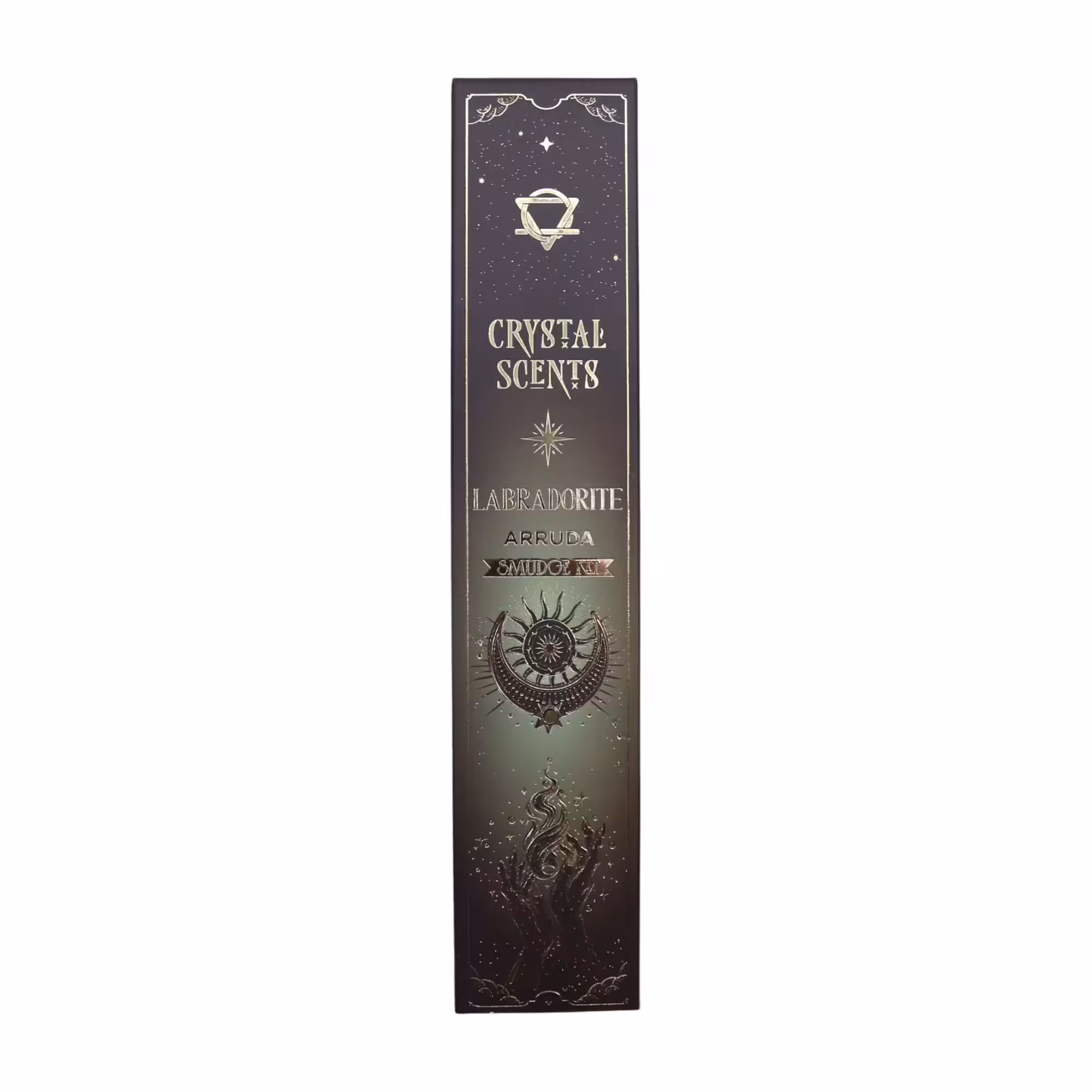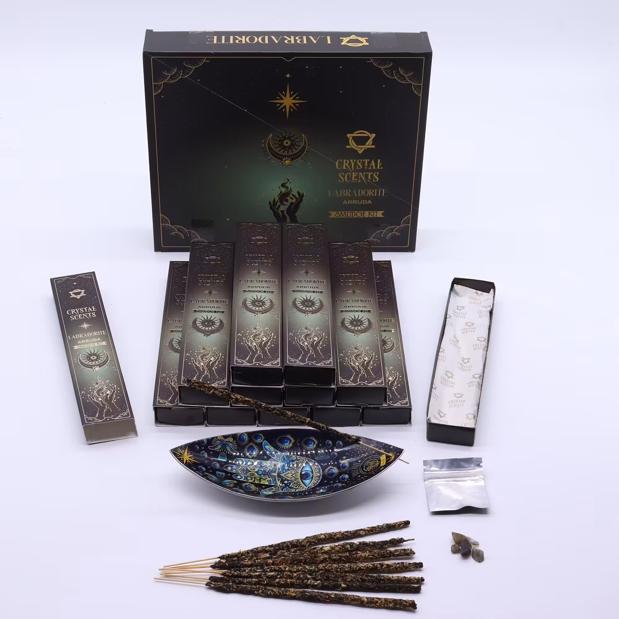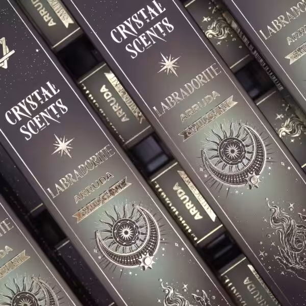 Refresh your space with the clean, herbal scent of Arruda, paired with natural labradorite chipstones. Each stick is handcrafted in India using traditional smudge-style incense methods.