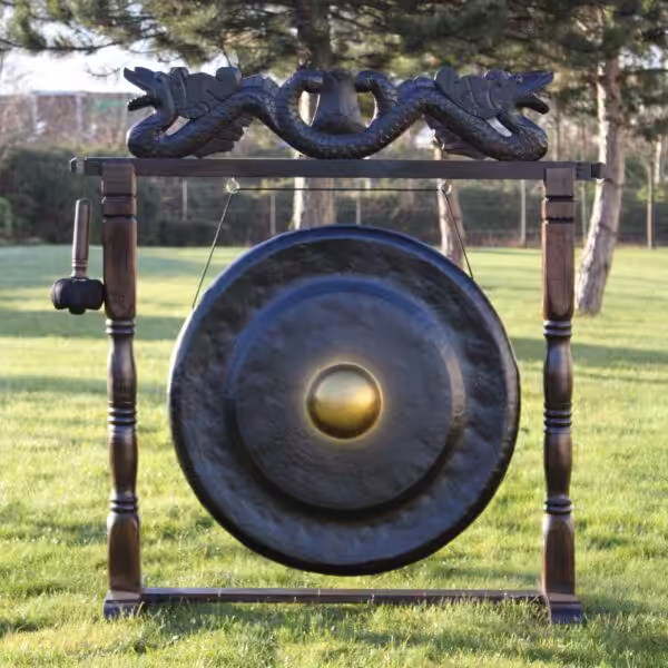 The gongs comes with a sturdy wooden carved stand. Making an attractive and useful artwork.