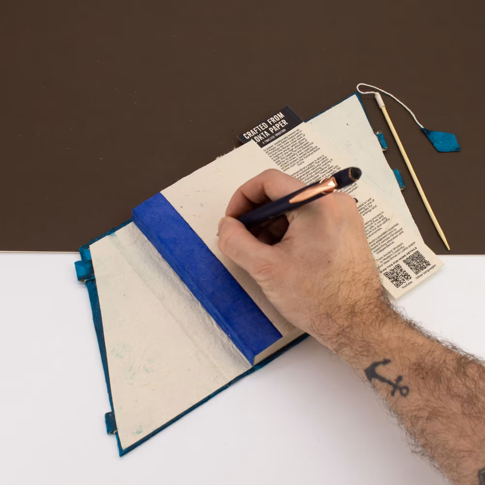 Deep midnight blue tones give this notebook a calm, modern feel, while the soft floral pattern adds gentle character. Compact and easy to carry, it’s perfect for everyday notes, sketches or ideas, finished with a simple bamboo lock that enhances its handcrafted style.