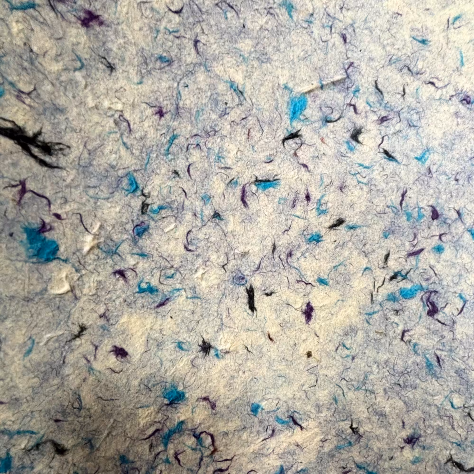 Add cool tones and natural texture to your gifts and creative projects with this handmade Lokta paper featuring blue cotton fibres. The soft base is flecked with shades of blue, purple and charcoal, creating a gently marbled, organic finish.