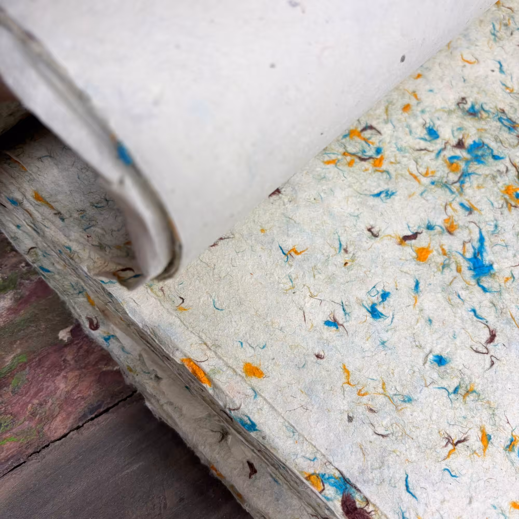 Give your gifts and creative projects a natural, earthy finish with this handmade Lokta paper featuring visible grass fibres. The soft, neutral base is enriched with scattered strands and coloured fibres, creating a textured, organic look full of character.