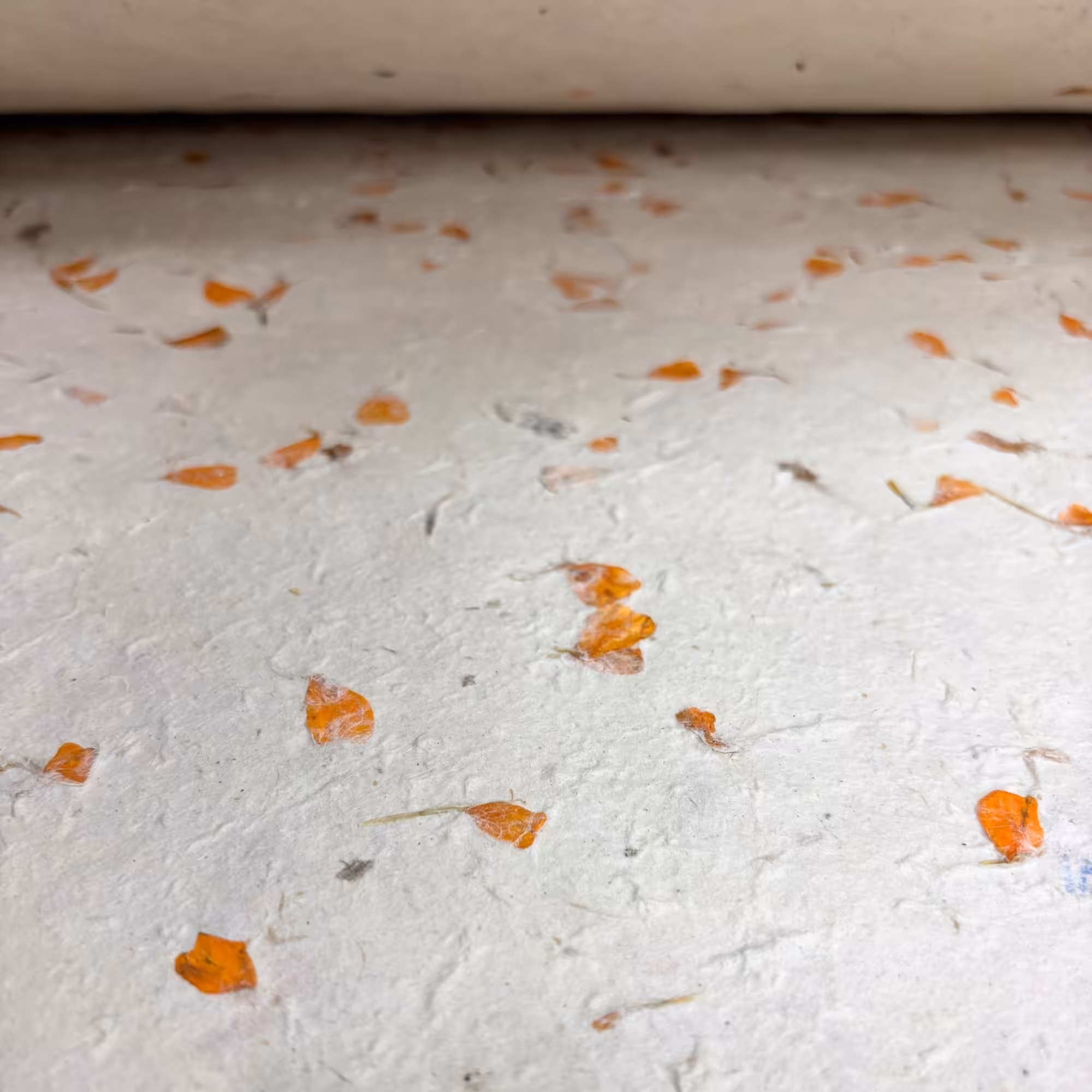 Add warmth and natural charm to your wrapping and craft projects with this handmade Lokta paper featuring real marigold petals. Each 51x76cm sheet blends soft texture with scattered orange petal fragments, creating a delicate, organic finish.