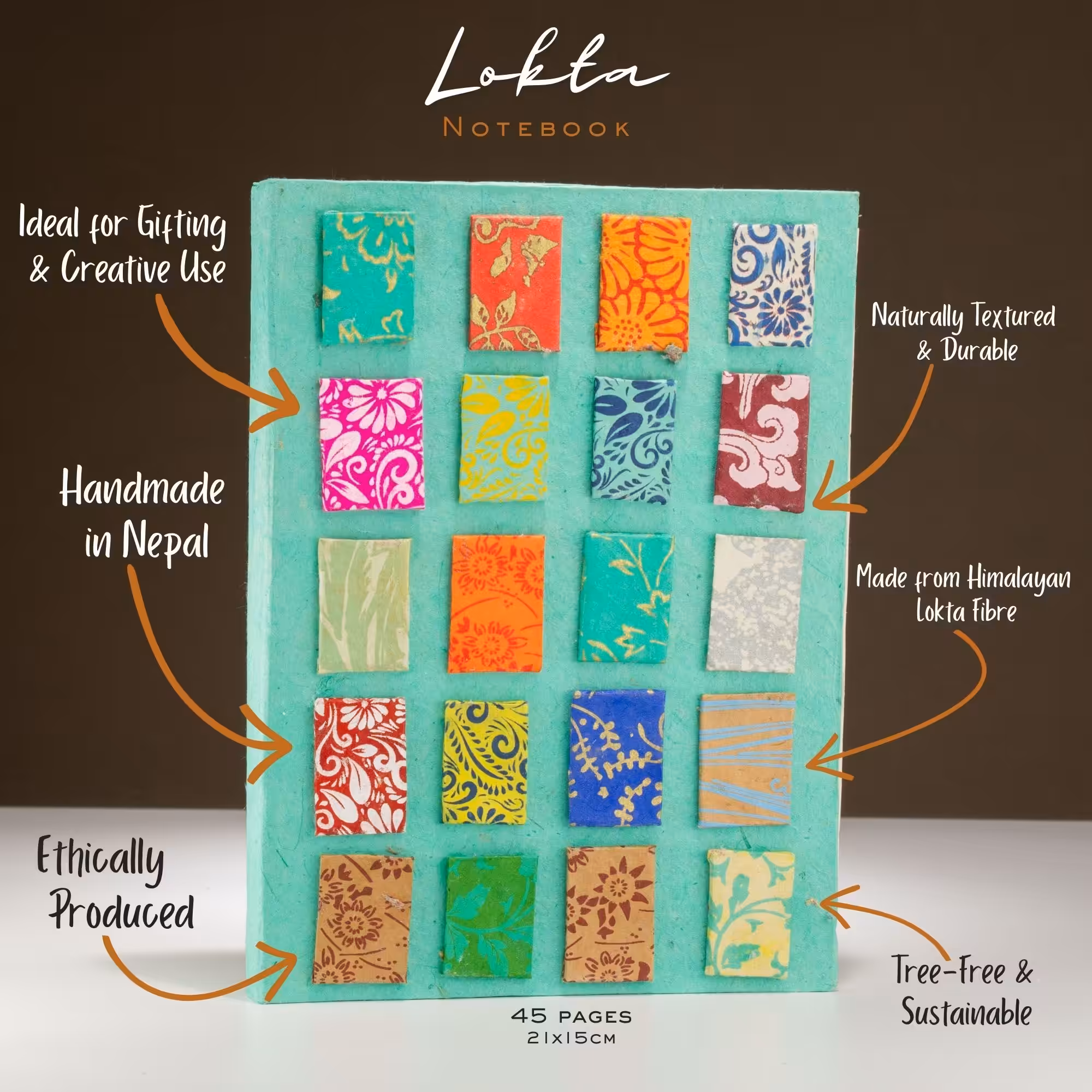 Lokta Mini Tiles Notebook – Large (21x15cm) – 45 Leaves – Includes Bookmark – Teal