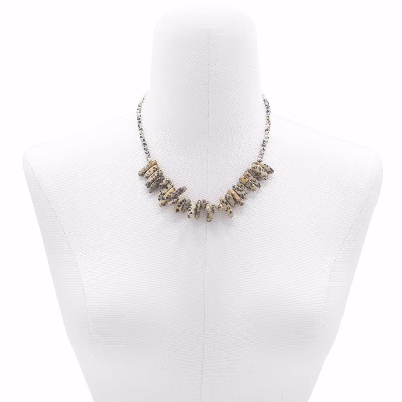 A playful and stylish accessory that's bound to capture attention. This necklace features Dalmatian Stone gemstones known for their distinctive black spots on a creamy white background, creating a unique and eye-catching design.