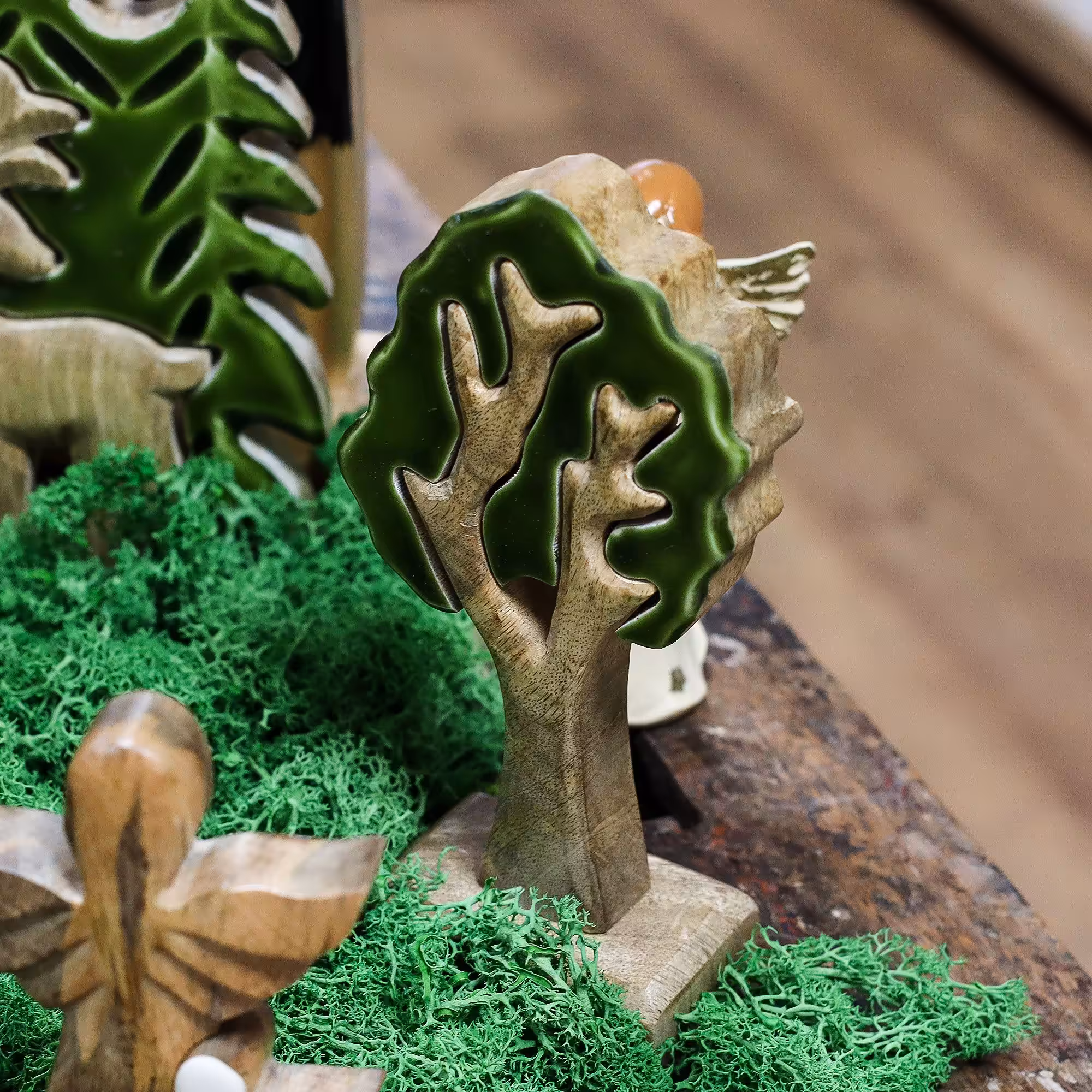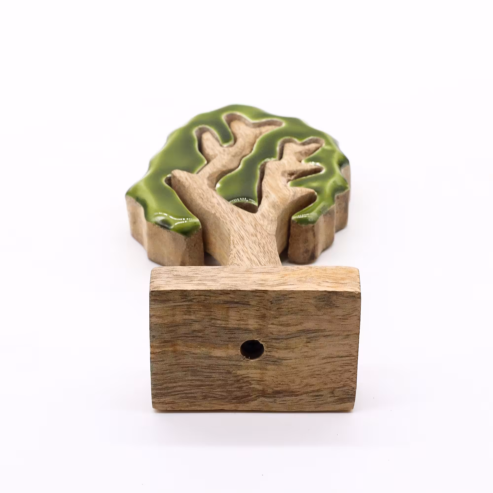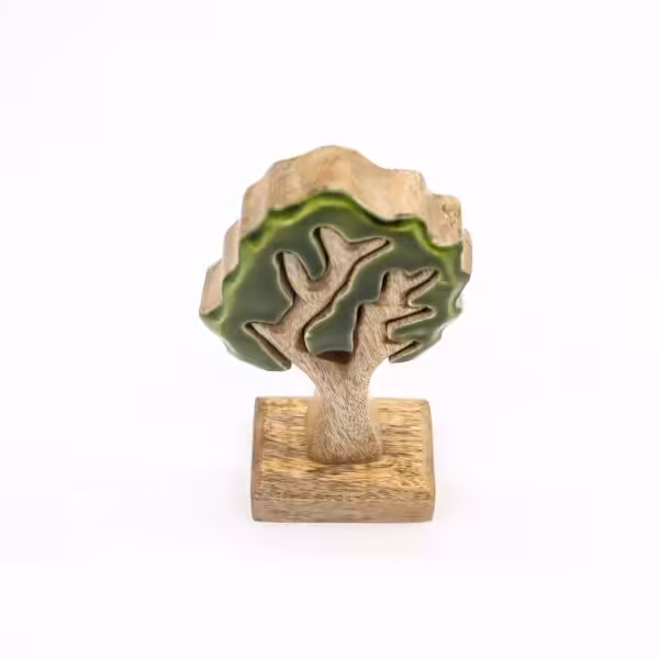 Simple, strikingand full of character — this standalone tree ornament captures the beauty of the forest in handcrafted form. Sculpted from sustainable mango wood and detailed with glossy green enamel, its layered 3D design makes it a lovely addition to nature-themed decor or seasonal displays.
