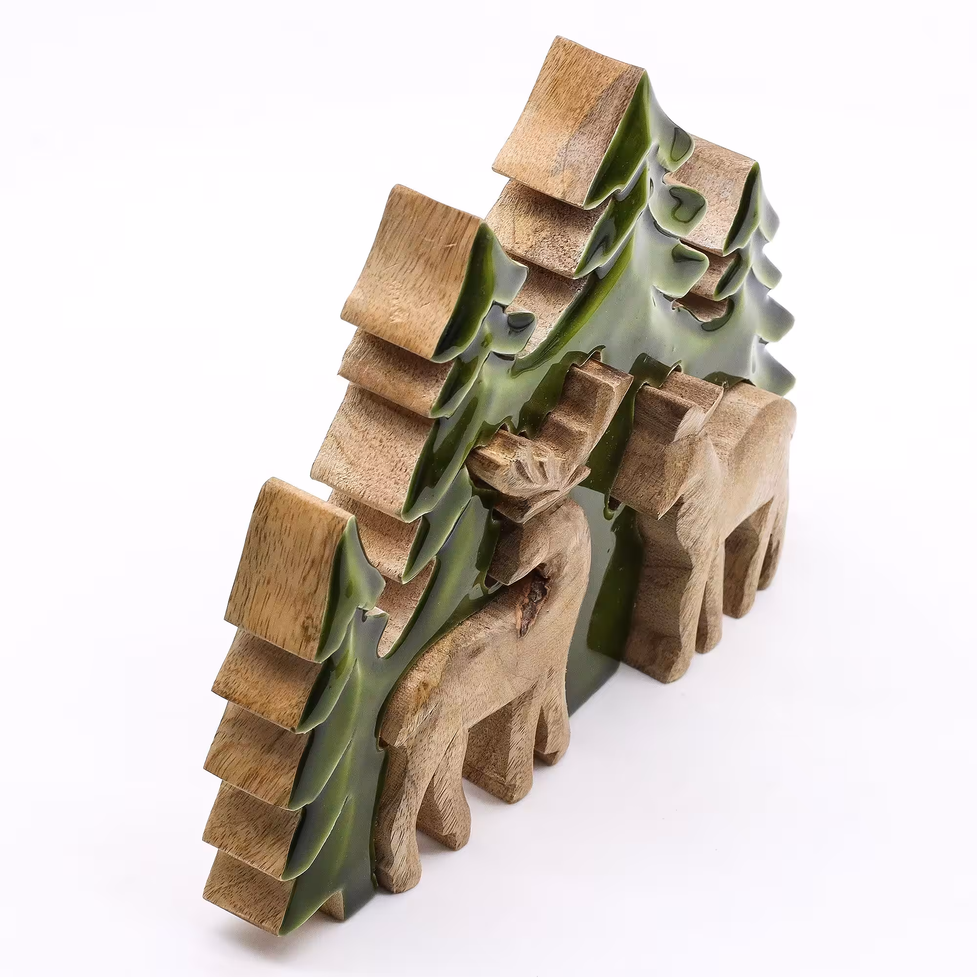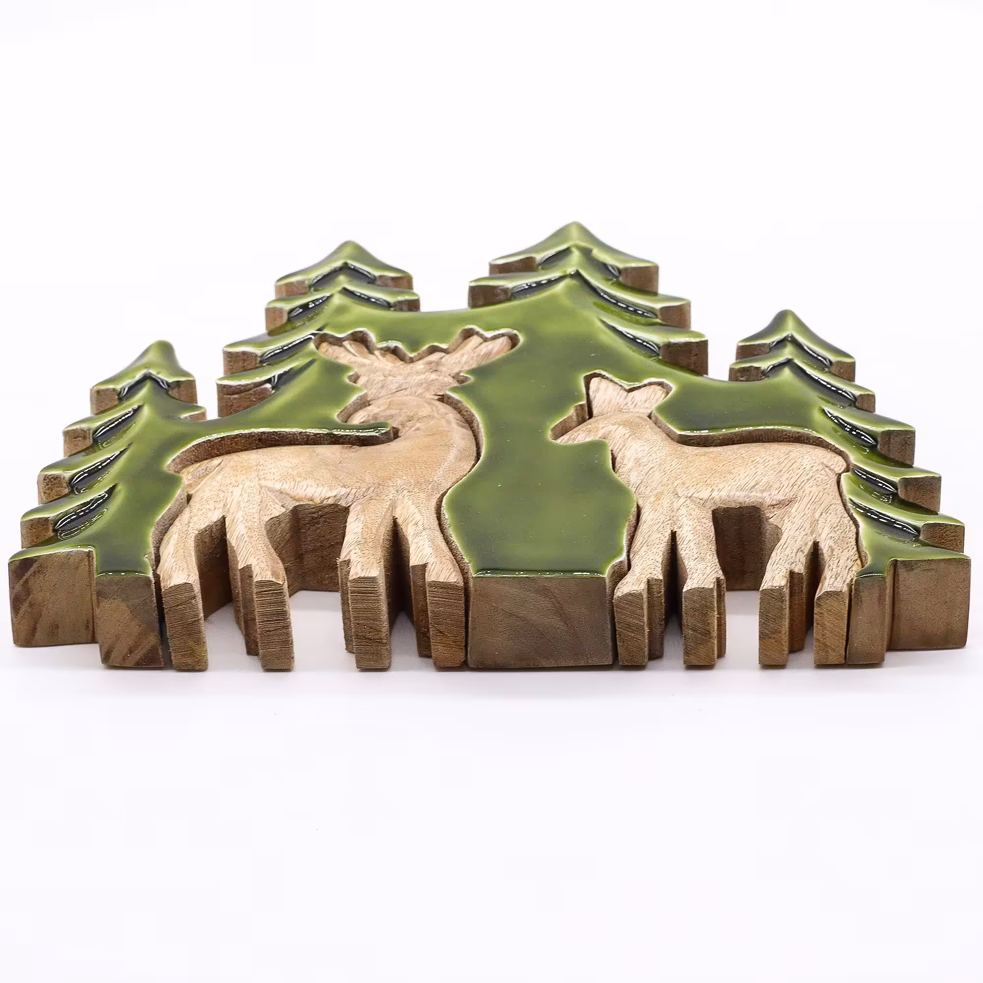 Celebrate the quiet beauty of nature with this Two Deer in the Forest ornament from the Lost in the Forest collection. Hand-carved from sustainable mango wood and accented with deep green enamel, this woodland scene features two deer standing peacefully among towering fir trees. The layered 3D effect brings the setting to life, making it a heartwarming focal piece for seasonal displays.
