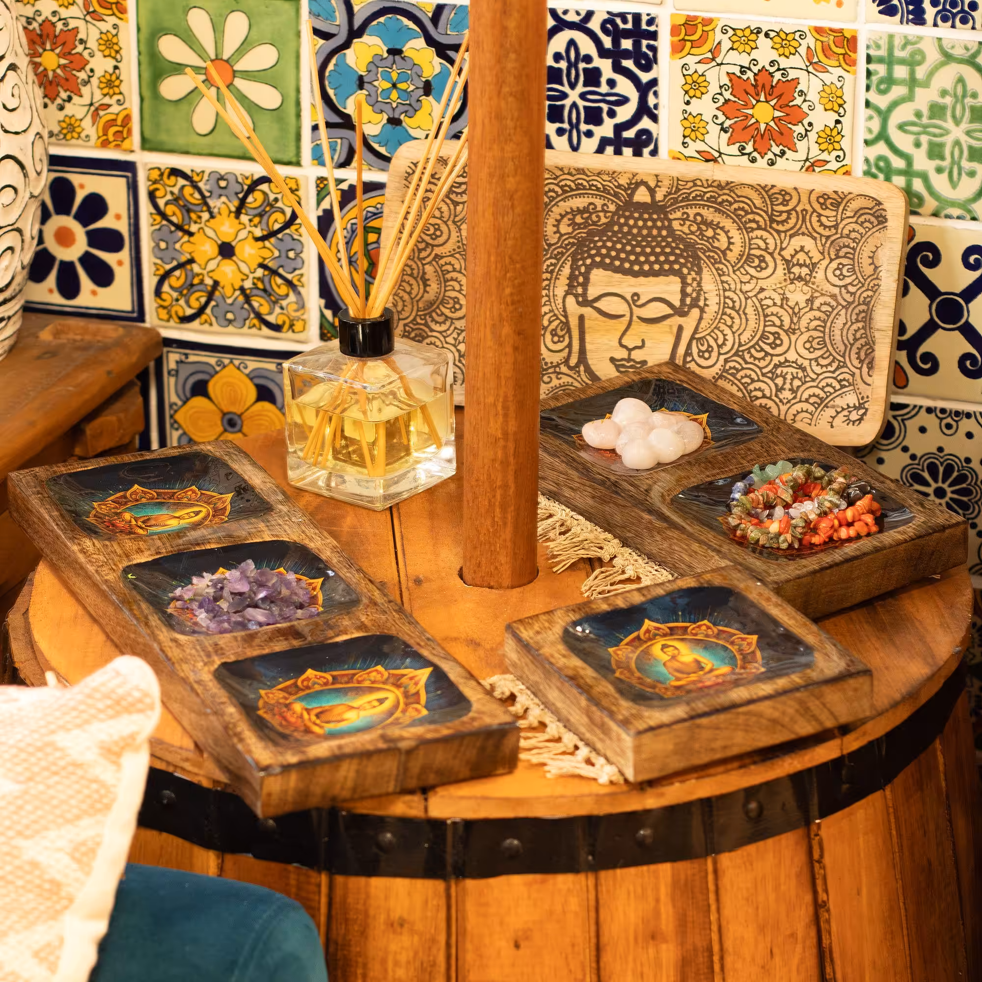 This Lrg Enamelled Mango Tray Set features a serene Buddha design, offering a sophisticated and spiritually uplifting addition to your giftware collection. Each set includes three versatile trays — available in single, double, and triple compartment configurations — crafted from mango wood.