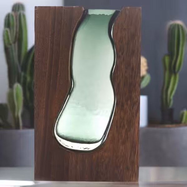 Measuring an impressive 18x5x32cm, they feature a captivating combination: a sleek, cylindrical glass vase nestled within a sophisticated dark tung wood frame. This modern design caters to a broad audience and complements a wide variety of plant life and decorative elements.