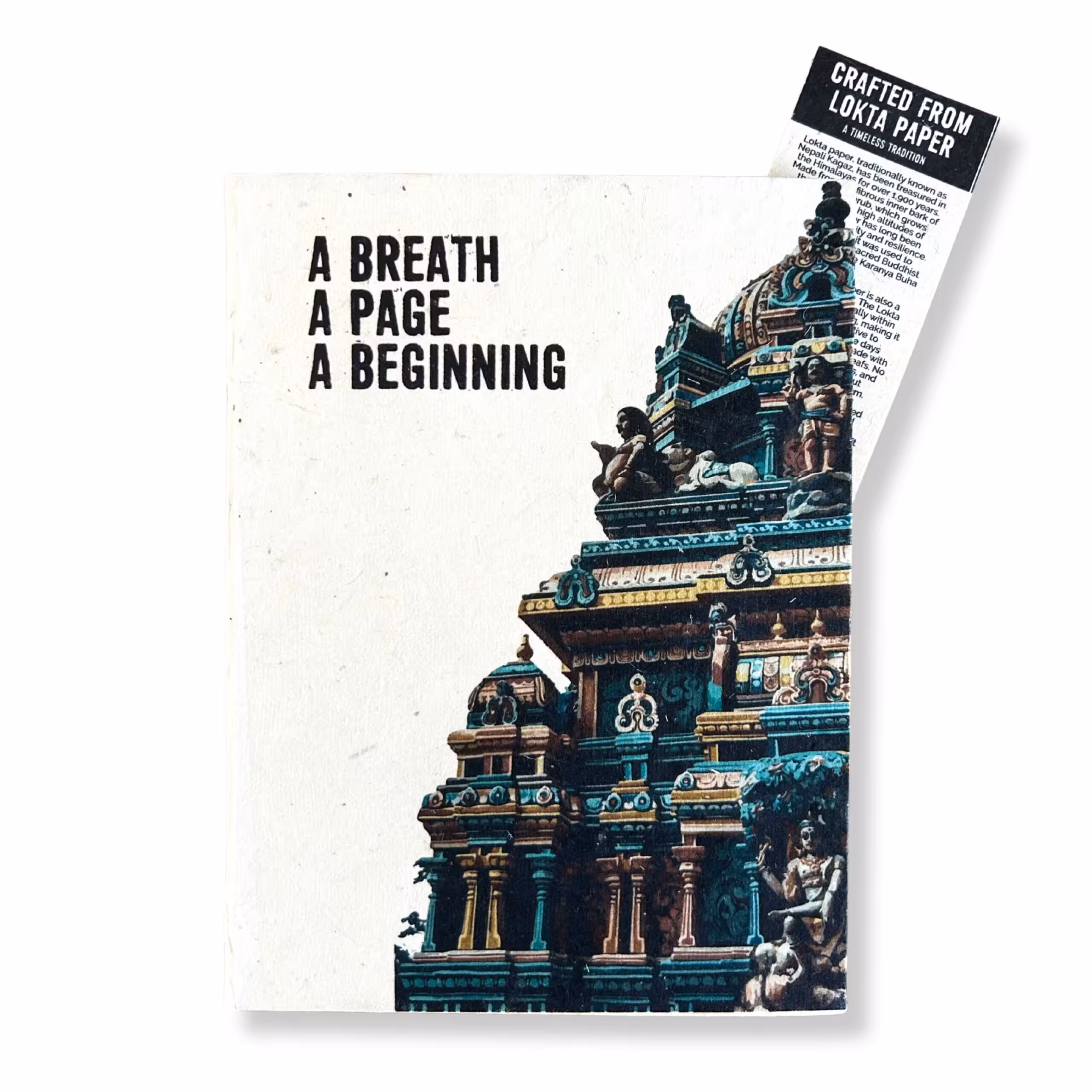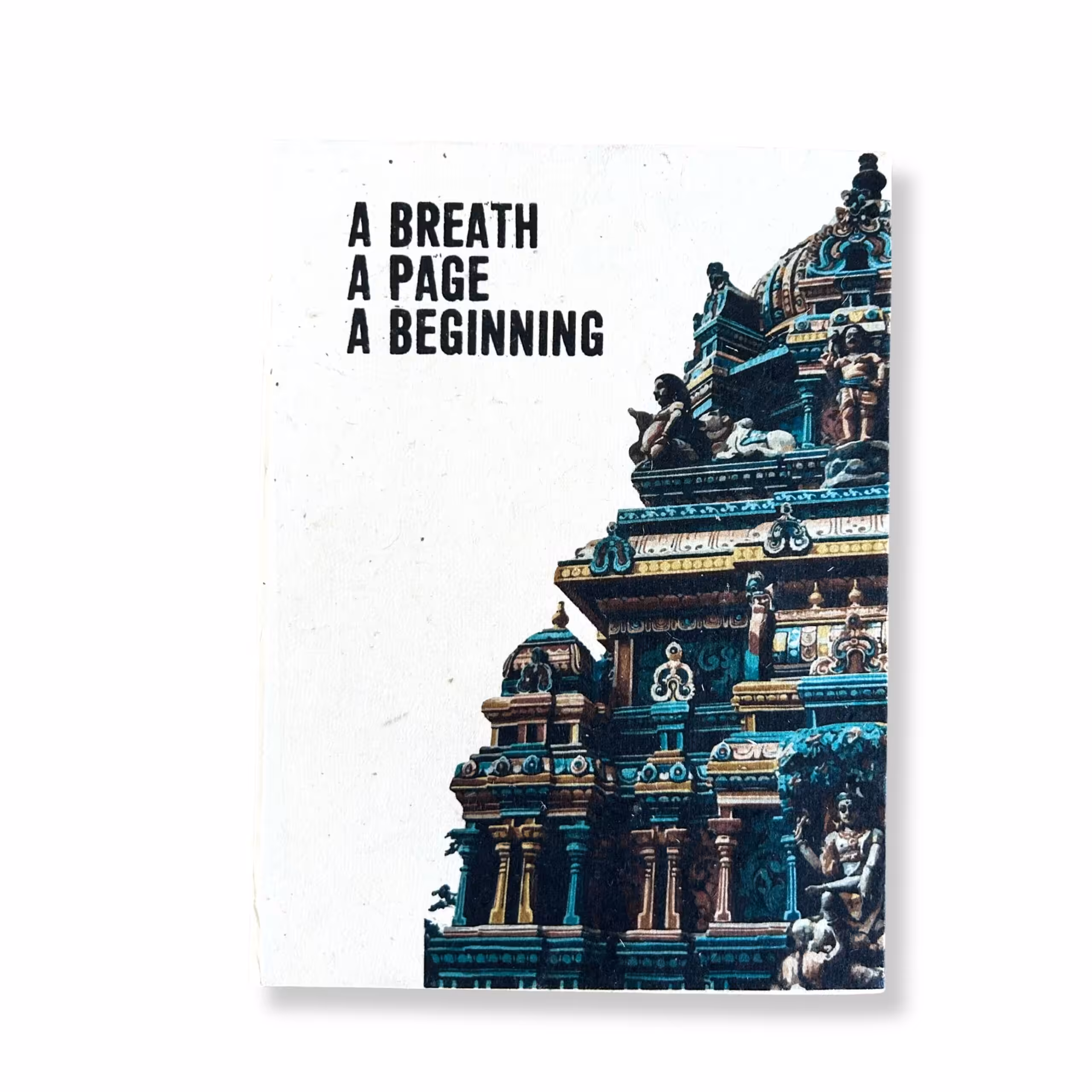 Calm and poetic, this notebook features an architectural temple motif paired with the phrase “A Breath, A Page, A Beginning,” evoking quiet focus and personal renewal. It’s a piece that appeals to customers looking for beauty and meaning in their writing tools.