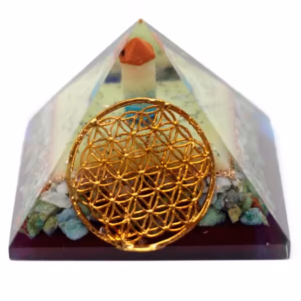 Lrg Organite Pyramid 80mm – Flower of life symbol