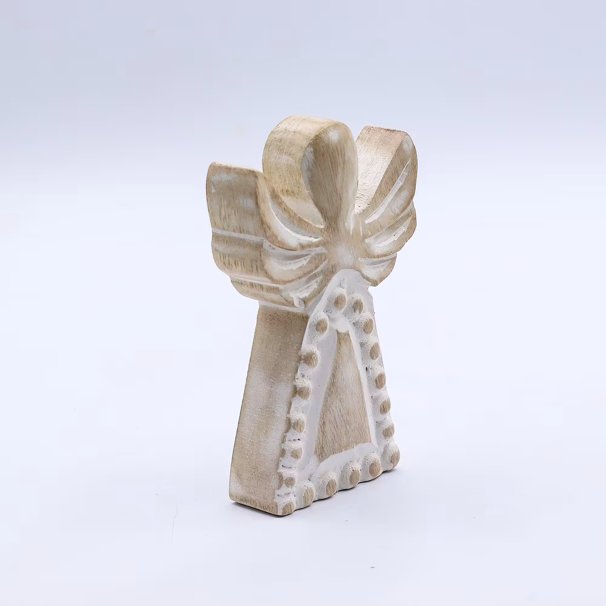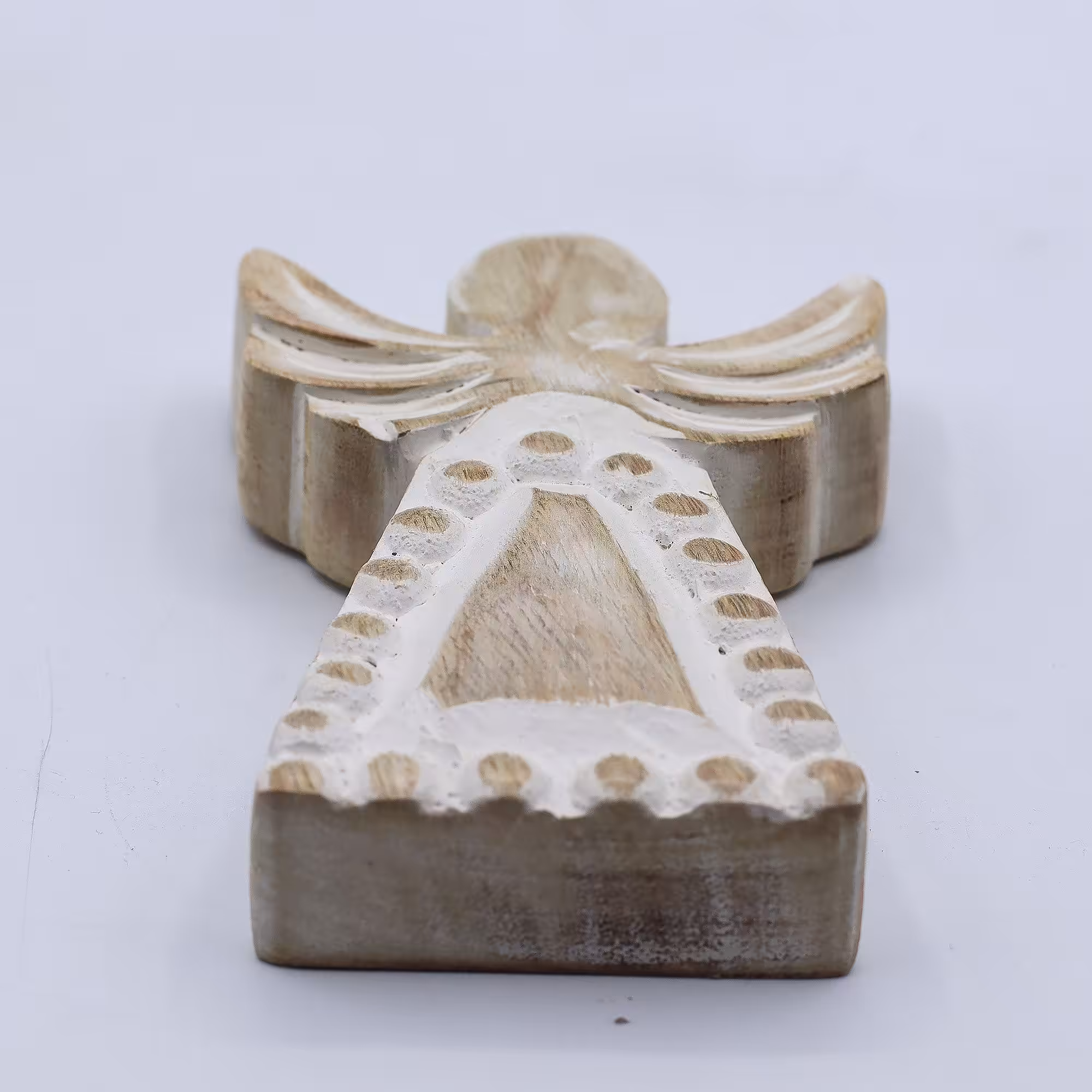 This delicate hand-carved angel, finished with a soft whitewash, brings a sense of calm and rustic beauty to your home. Its distressed texture and gentle details make it a thoughtful gift or a peaceful accent for your own space.