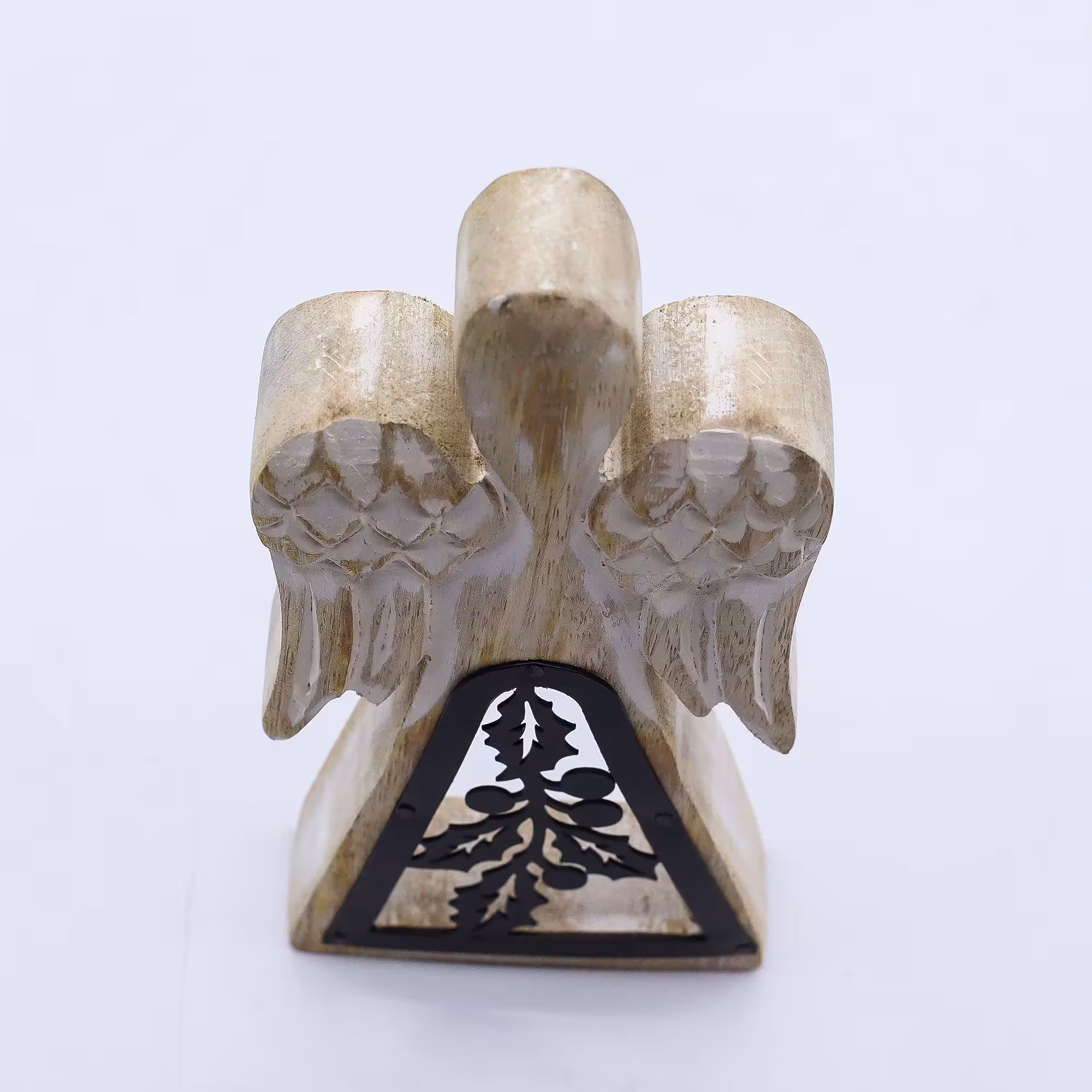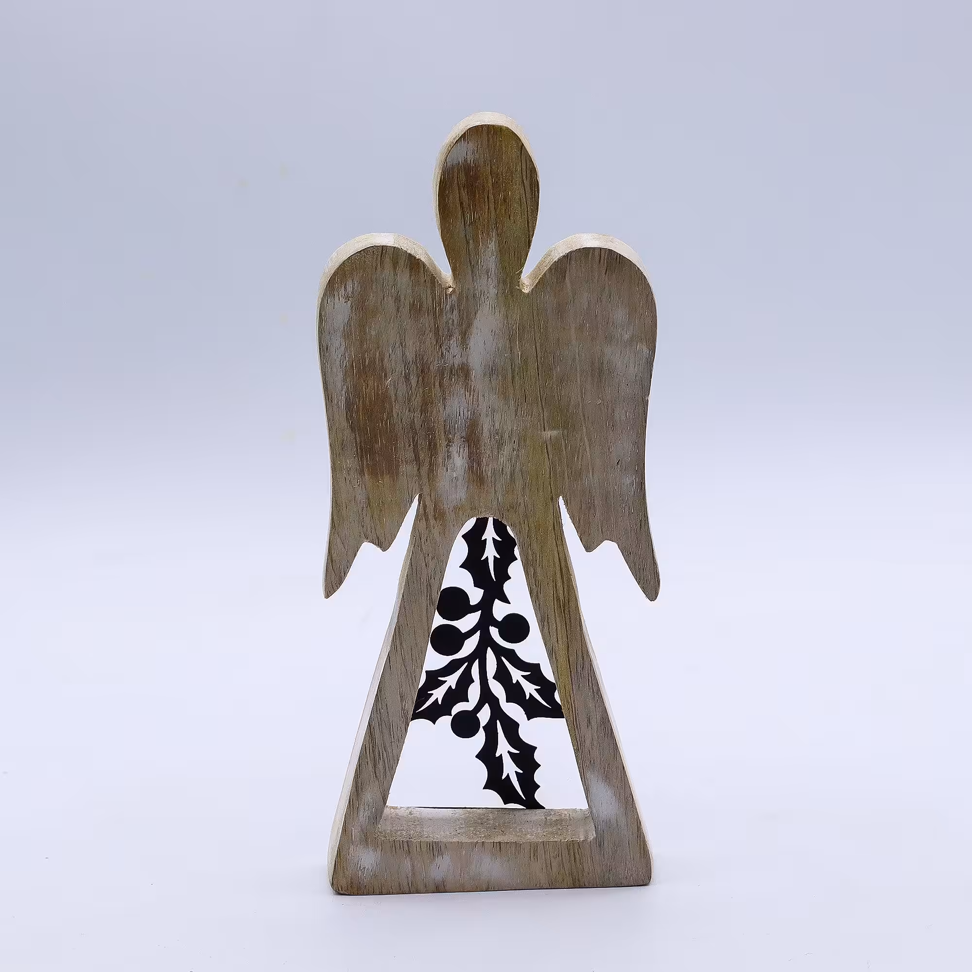 Hand-carved from mango wood and finished in a soft whitewash, this elegant angel stands 18cm tall and features a striking iron holly cut-out in its skirt. A beautiful mix of rustic wood and dark metal detail makes it a unique piece for gifting or decorating your home.