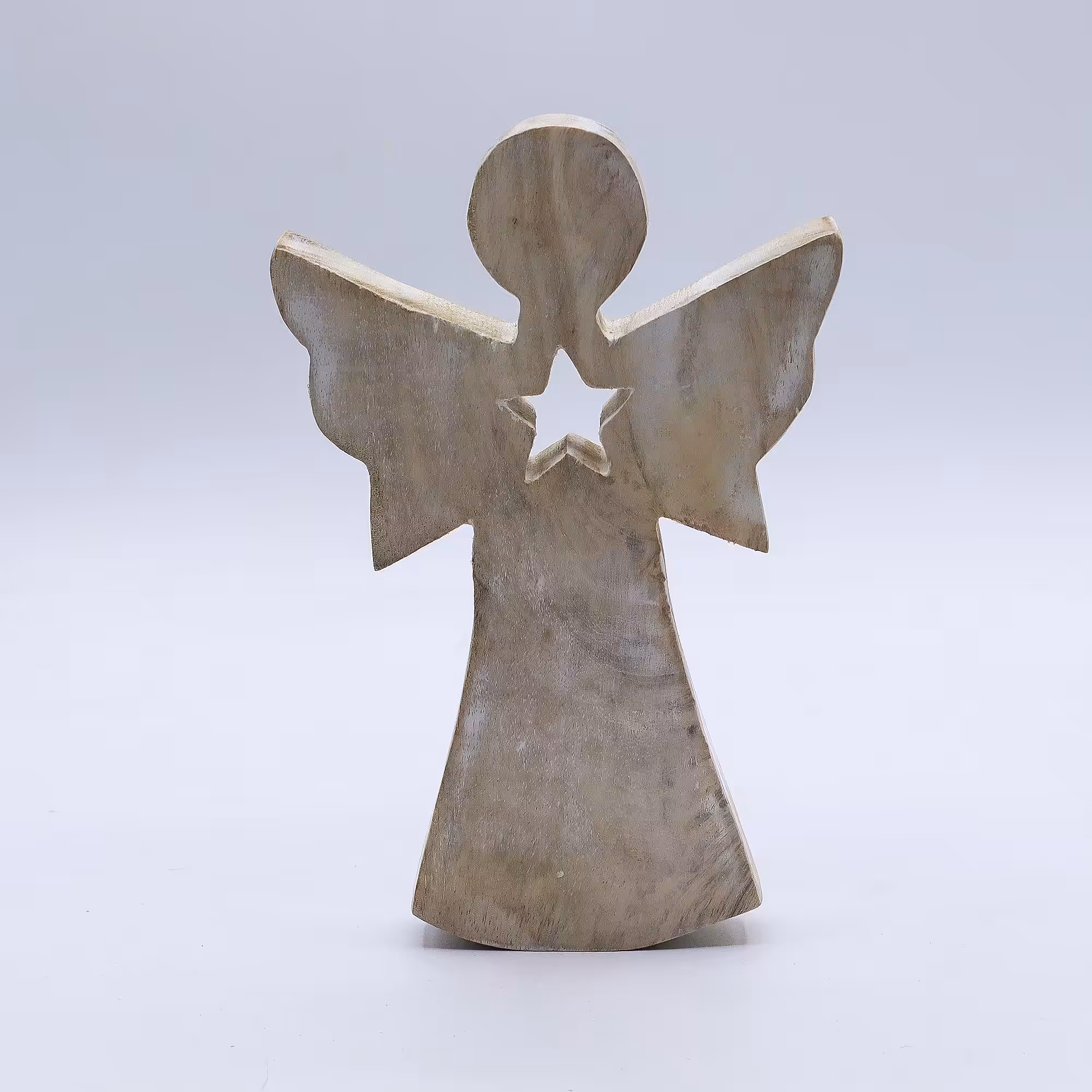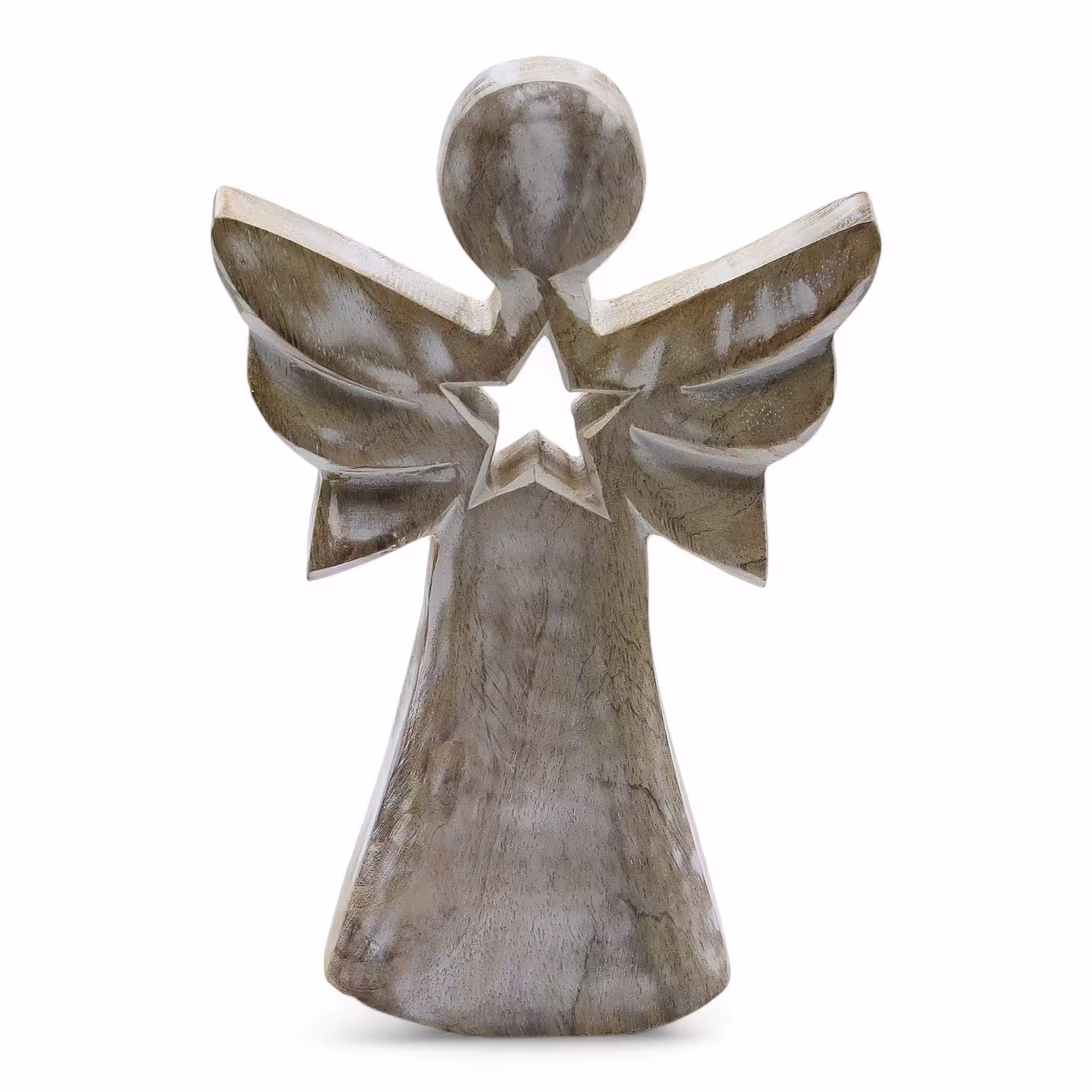 Hand-carved from mango wood and finished in a soft whitewash, this graceful angel features a star-shaped cut-out at its centre, symbolising light, hopeand guidance. At 18cm tall, it makes a heartfelt gift or a calming accent for your home.