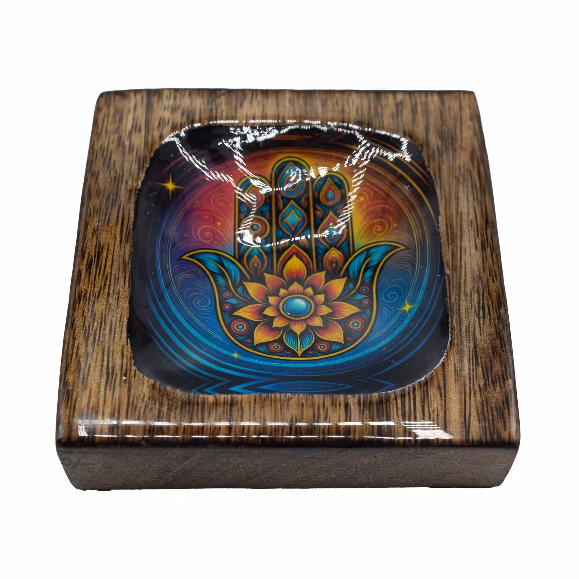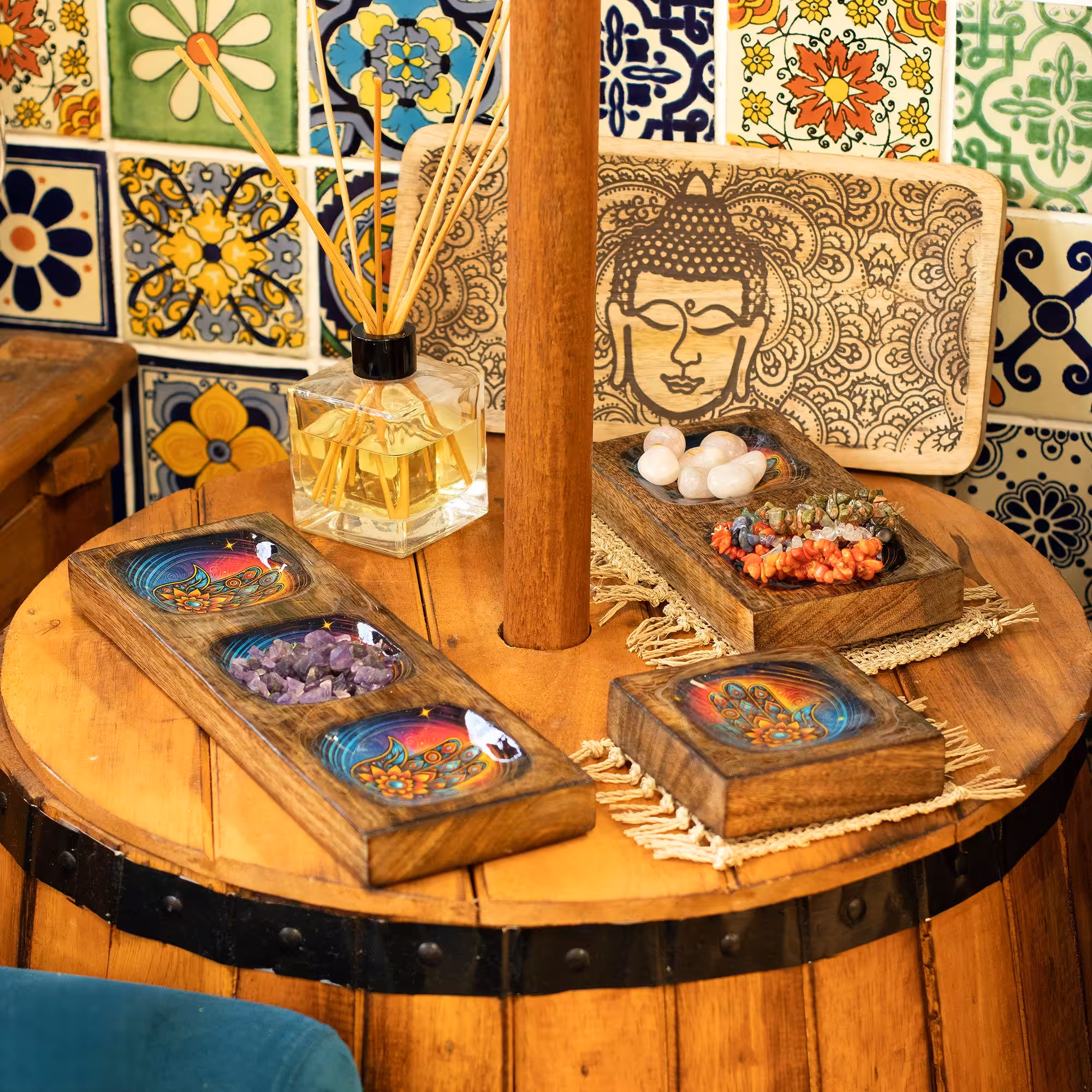 This Med Enamelled Mango Tray Set features the vibrant and protective Hamsa symbol, offering a colourful and spiritual addition to your inventory. The set consists of three varying sizes — single, double, and triple compartments — crafted from solid mango wood with a smooth, polished finish.