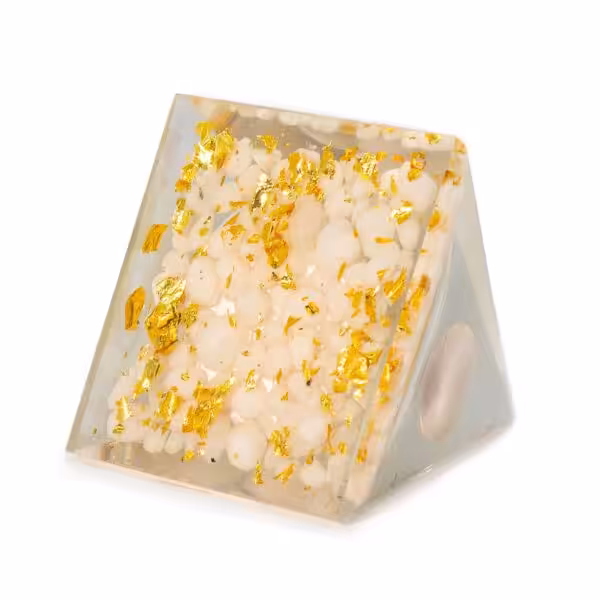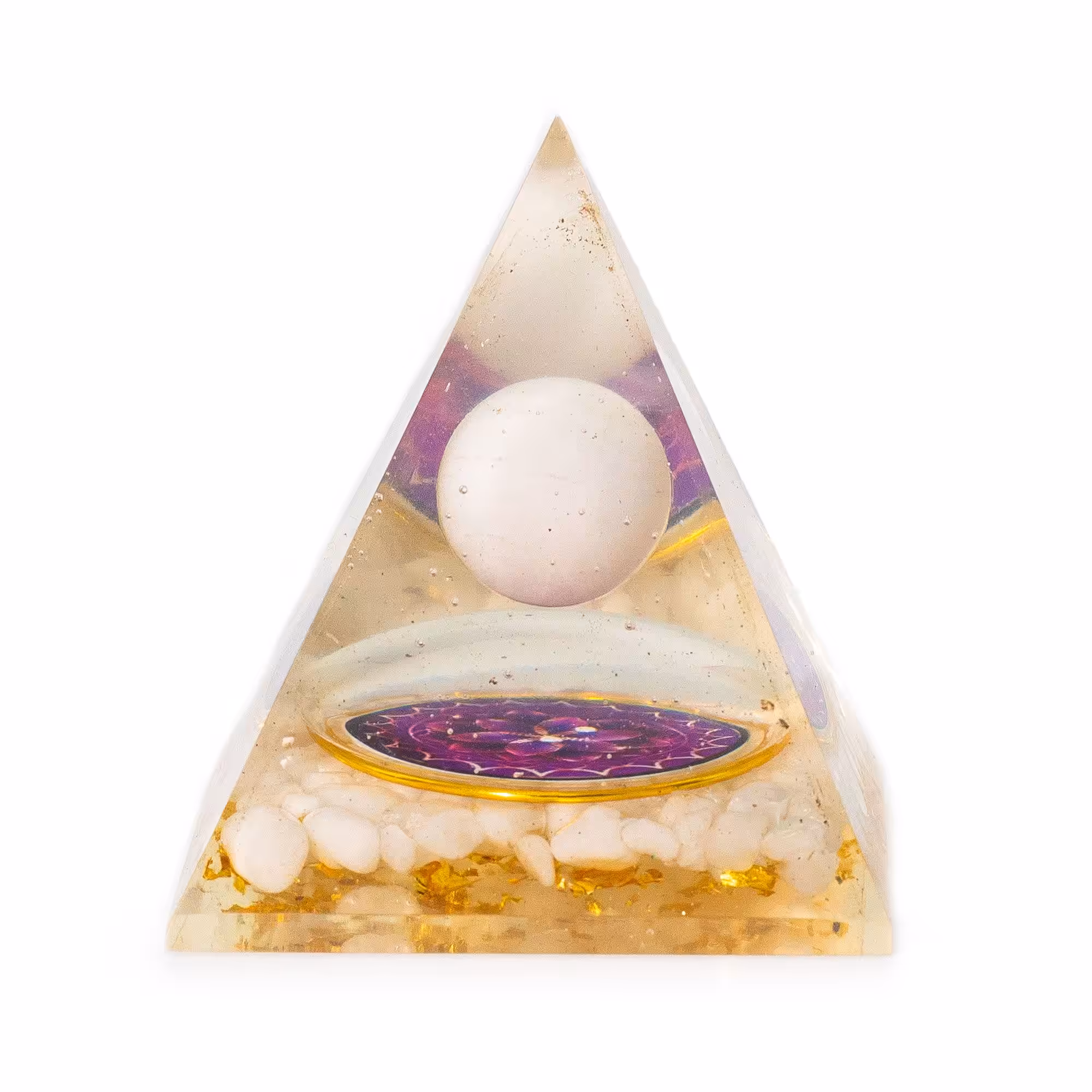 This orgone pyramid captures a serene balance between energy and light. A white quartz sphere appears to float gracefully above a geometric mandala, radiating calm and clarity. The base, filled with natural quartz chunks and gold flakes, enhances the pyramid’s purifying energy flow.