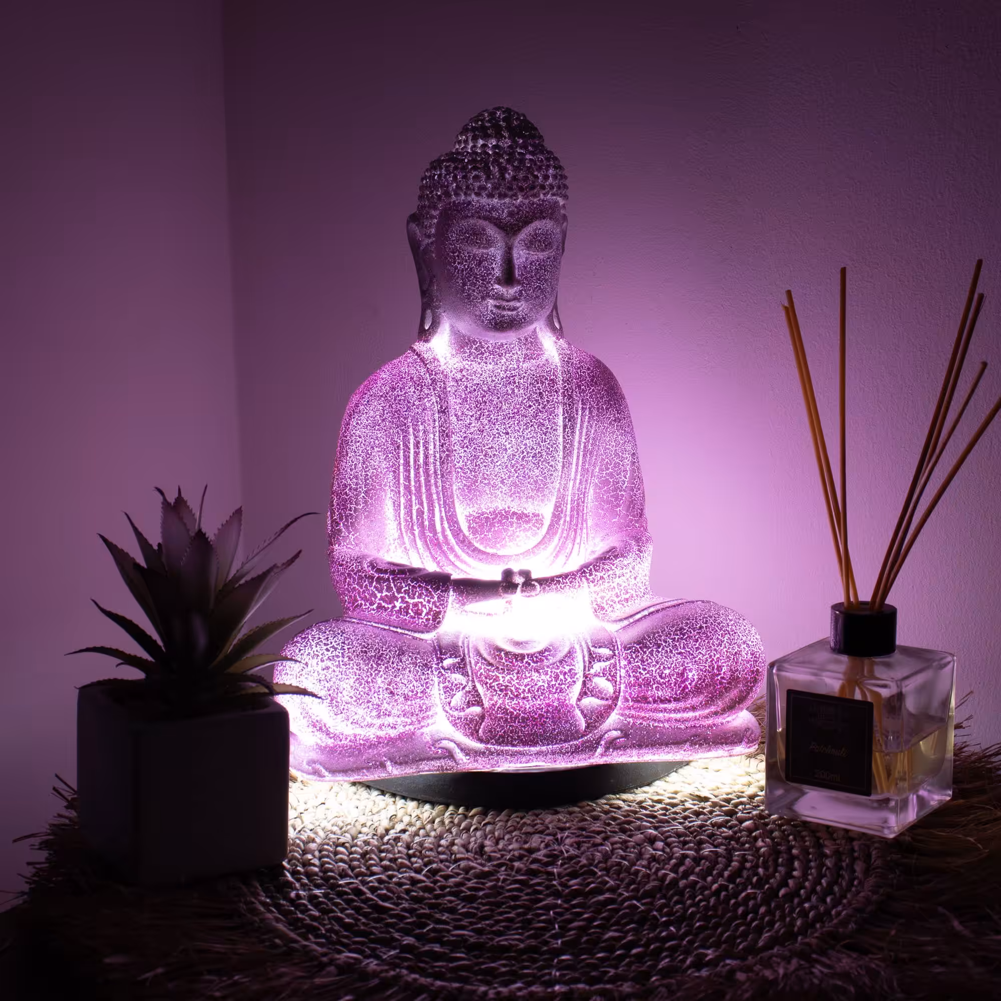 Soft, soothing, and effortlessly calming – this Meditation Buddha Lamp in Lavender Crackle is designed to bring a gentle sense of peace into any space.