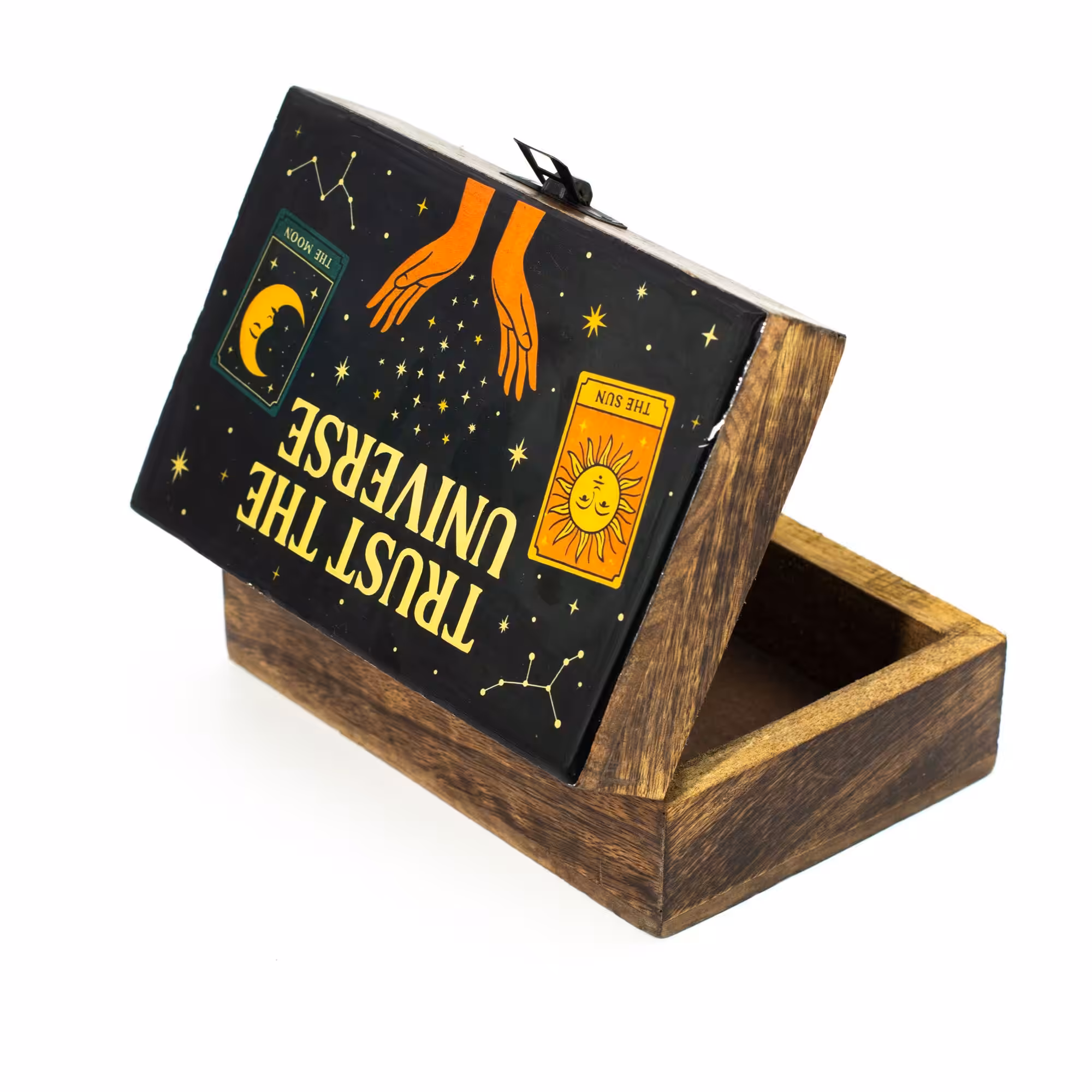 This medium mango wood box is a gentle reminder to let go and trust the bigger picture. The enamelled lid features the Trust the Universe design, with open hands, stars, and tarot-inspired symbols of the sun and moon set against a deep cosmic backdrop. Calm, grounding, and quietly reassuring.
