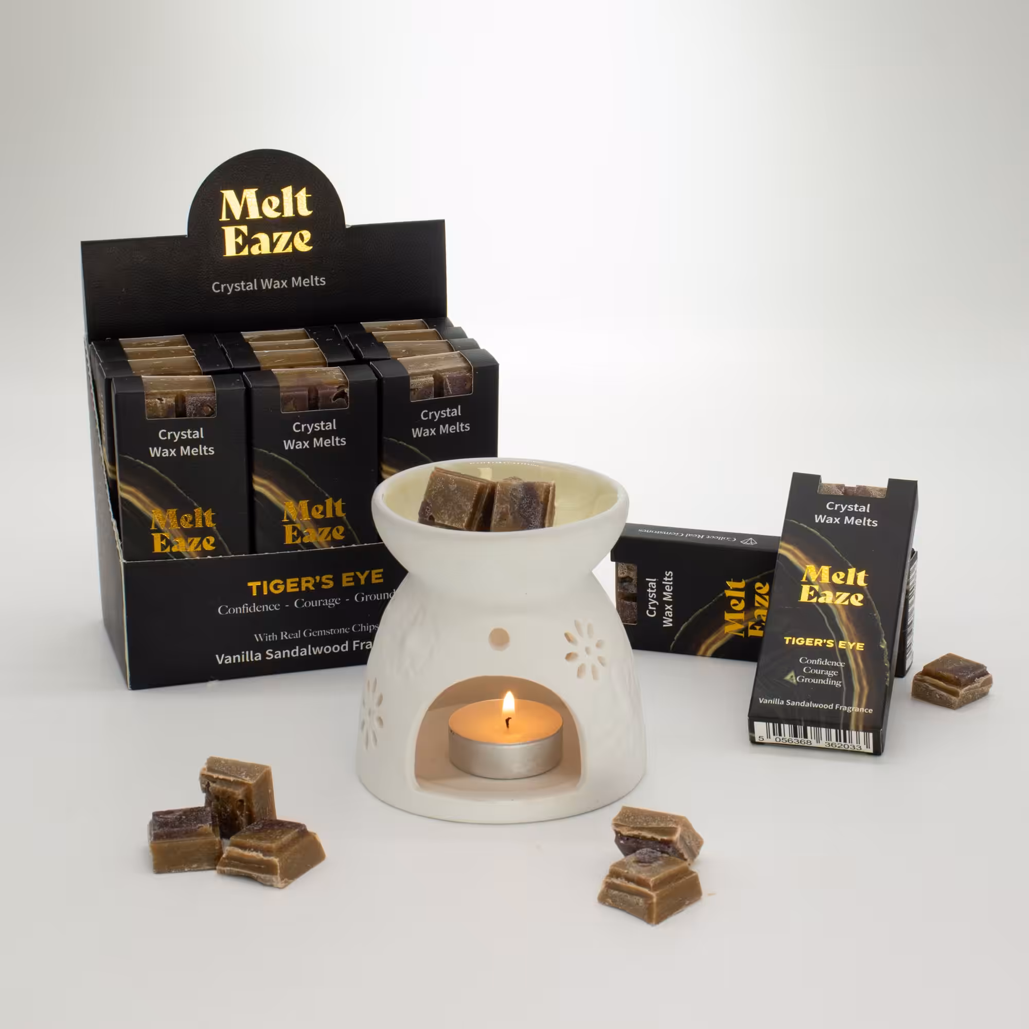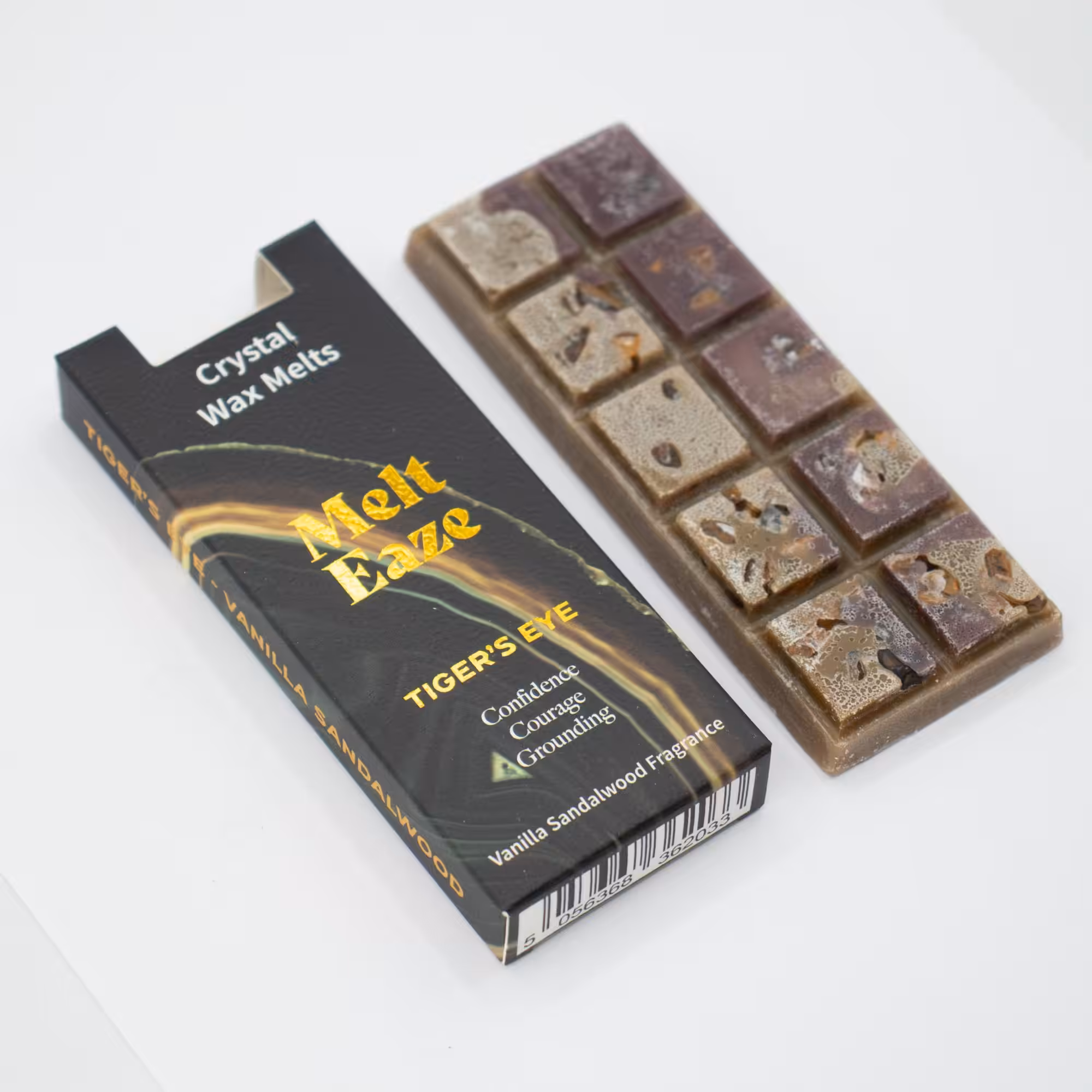 Create a warm and grounding atmosphere with MeltEaze Tigereye Strength Wax Melts. Rich, earthy tones are paired with a smooth vanilla sandalwood fragrance, inspired by Tiger’s Eye, often linked with confidence, courage, and grounding energy.