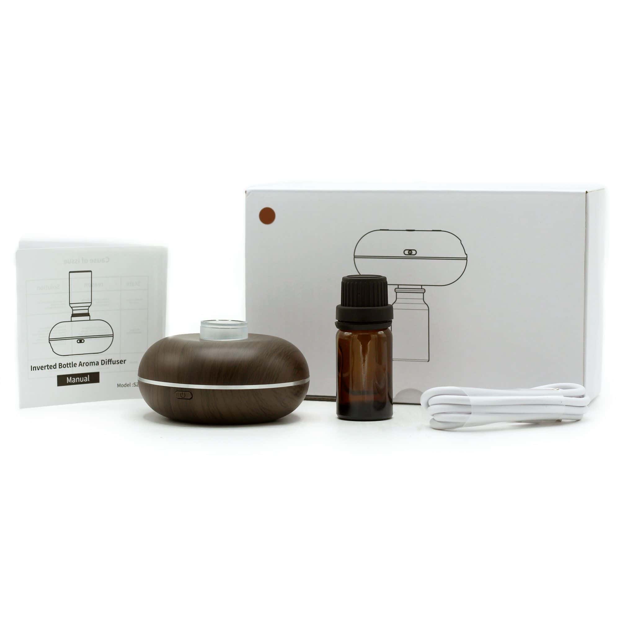 Turn the diffuser over and insert the essential oil bottle, turn clockwise to tighten and counter clockwise to loosen the bottle. (Note: When installing essential oil, please do not remove the throttle valve).