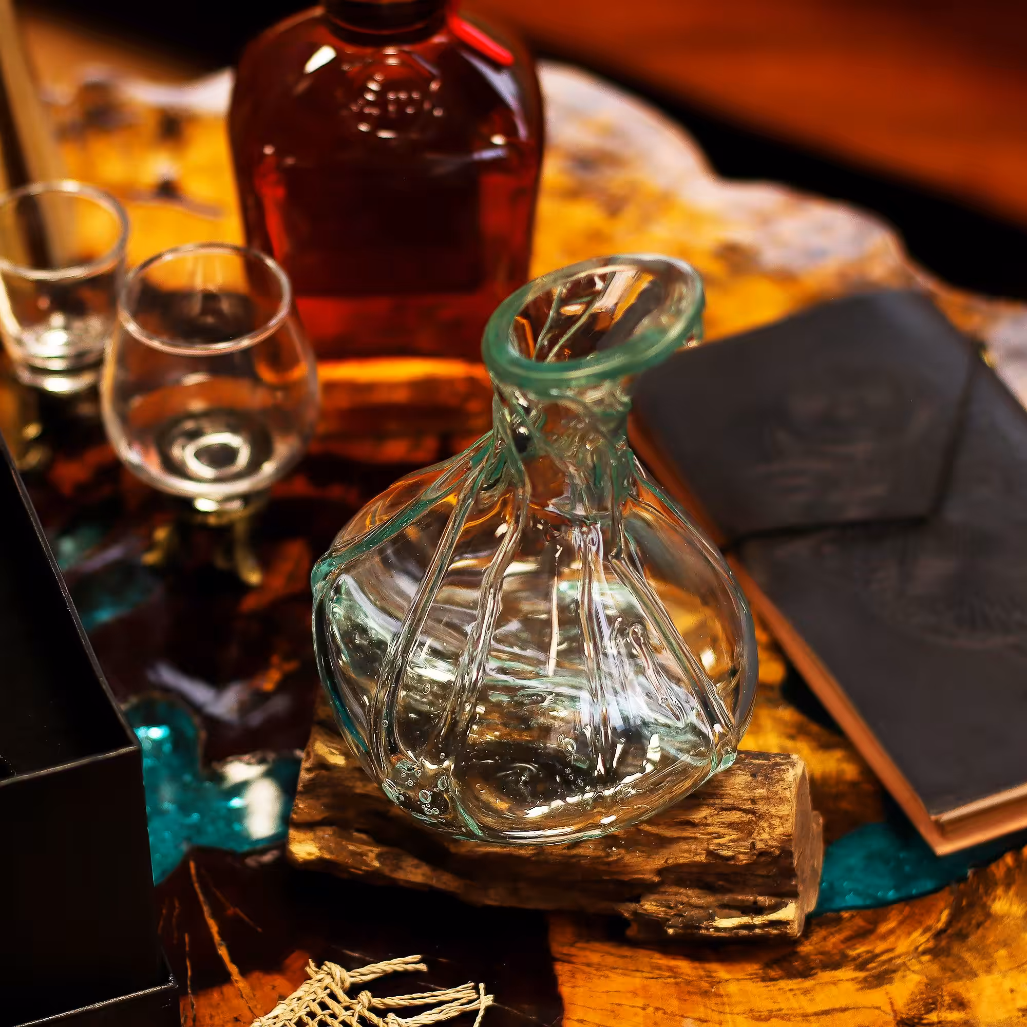 A captivating blend of craftsmanship and nature. Each decanter is hand-blown from recycled glass and shaped directly over a reclaimed Gamal wood base, creating a one-of-a-kind sculptural piece.
