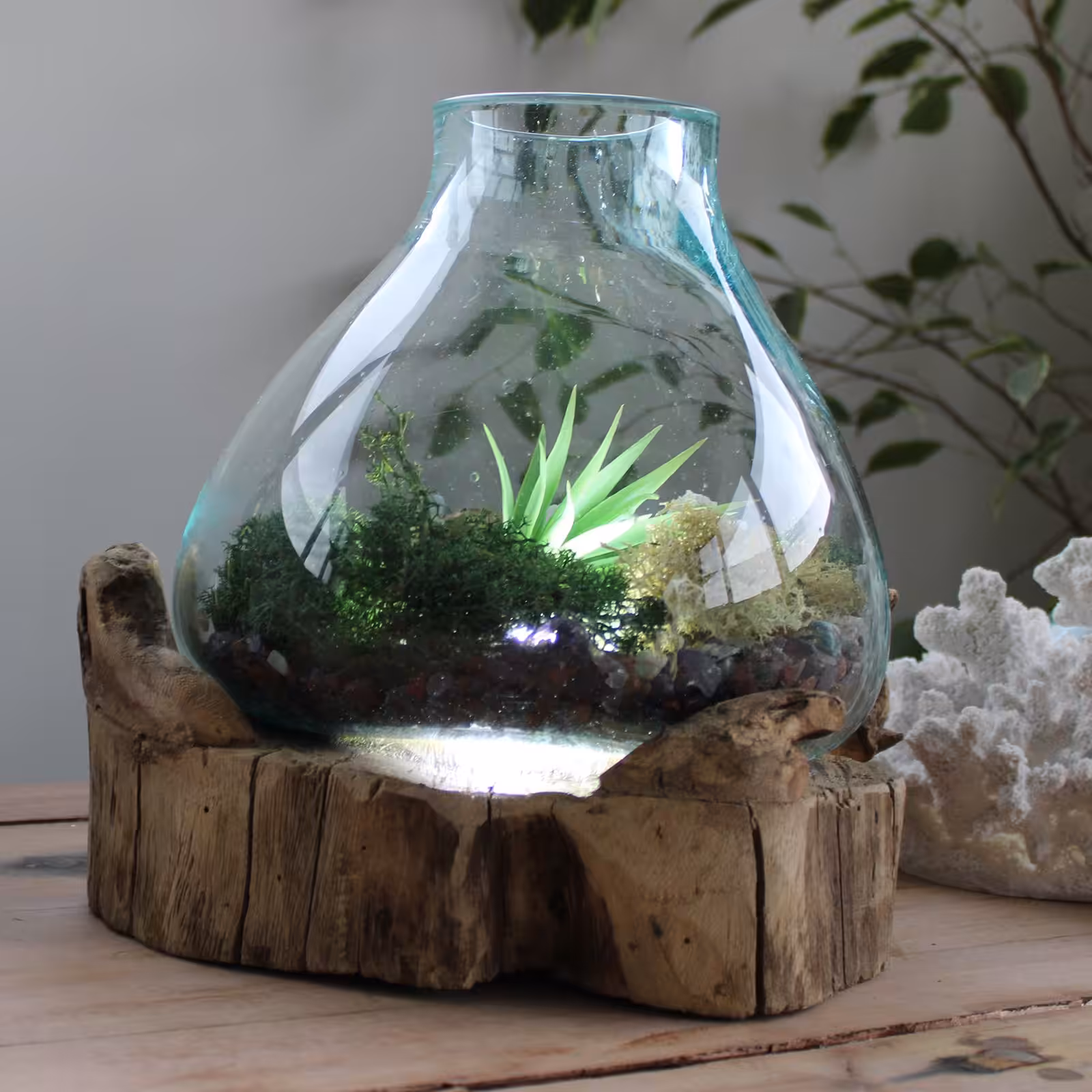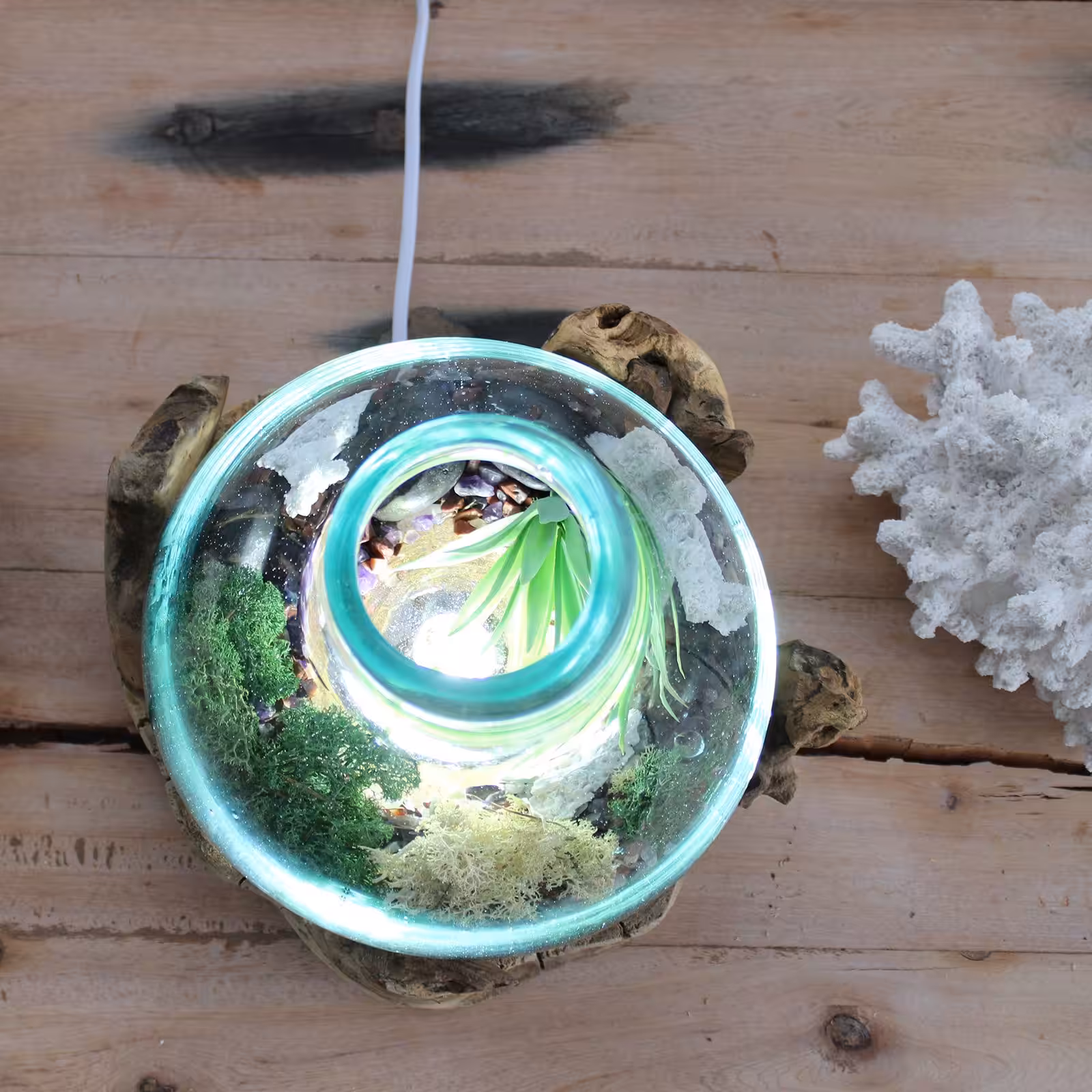 The glass is hand-blown and while still hot it is then relaxed over a piece of Gamal root, the glass then hardens to the shape of the wood ensuring a perfect fit. They are crafted using a natural product by using hand tools in the traditional Balinese way. It provides a one-of-a-kind setting for stones and air plants. Each item is unique as they are made from natural sustainable Gamal wood and the recycled glass is shaped to suit which add to its authenticity, your customer will love it. They can be used for house plants, zen gardens or floating candles. The wooden base has a cavity for the cable and bulb fitting.