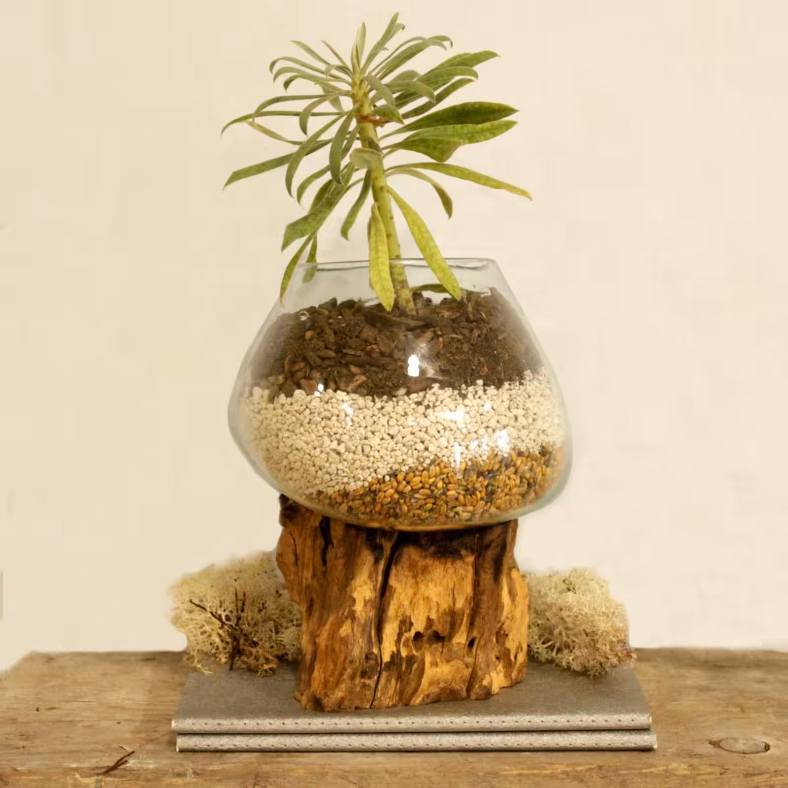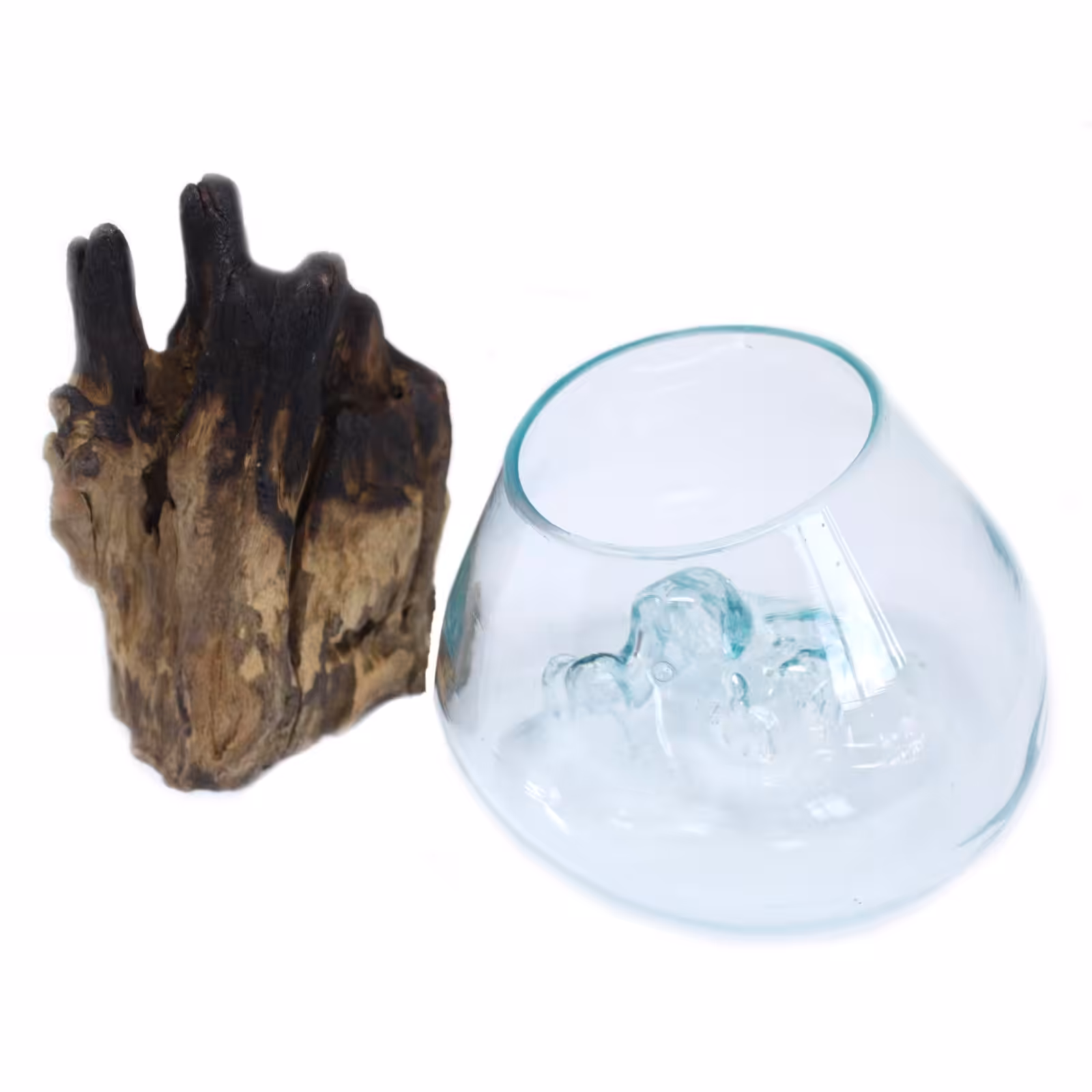 The glass is hand-blown and while still hot it is then relaxed over a piece of Gamal root, the glass then hardens to the shape of the wood ensuring a perfect fit. They are crafted using a natural product by using hand tools in the traditional Balinese way. It provides a one-of-a-kind setting for stones and air plants, cut flowers or a wine decanter.