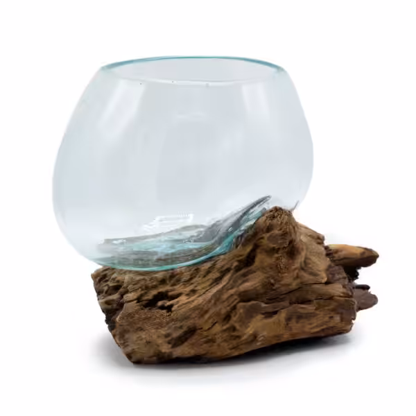 The glass is hand-blown and while still hot it is then relaxed over a piece of Gamal root, the glass then hardens to the shape of the wood ensuring a perfect fit. They are crafted using a natural product by using hand tools in the traditional Balinese way. It provides a one-of-a-kind setting for stones and air plants, cut flowers or a wine decanter.