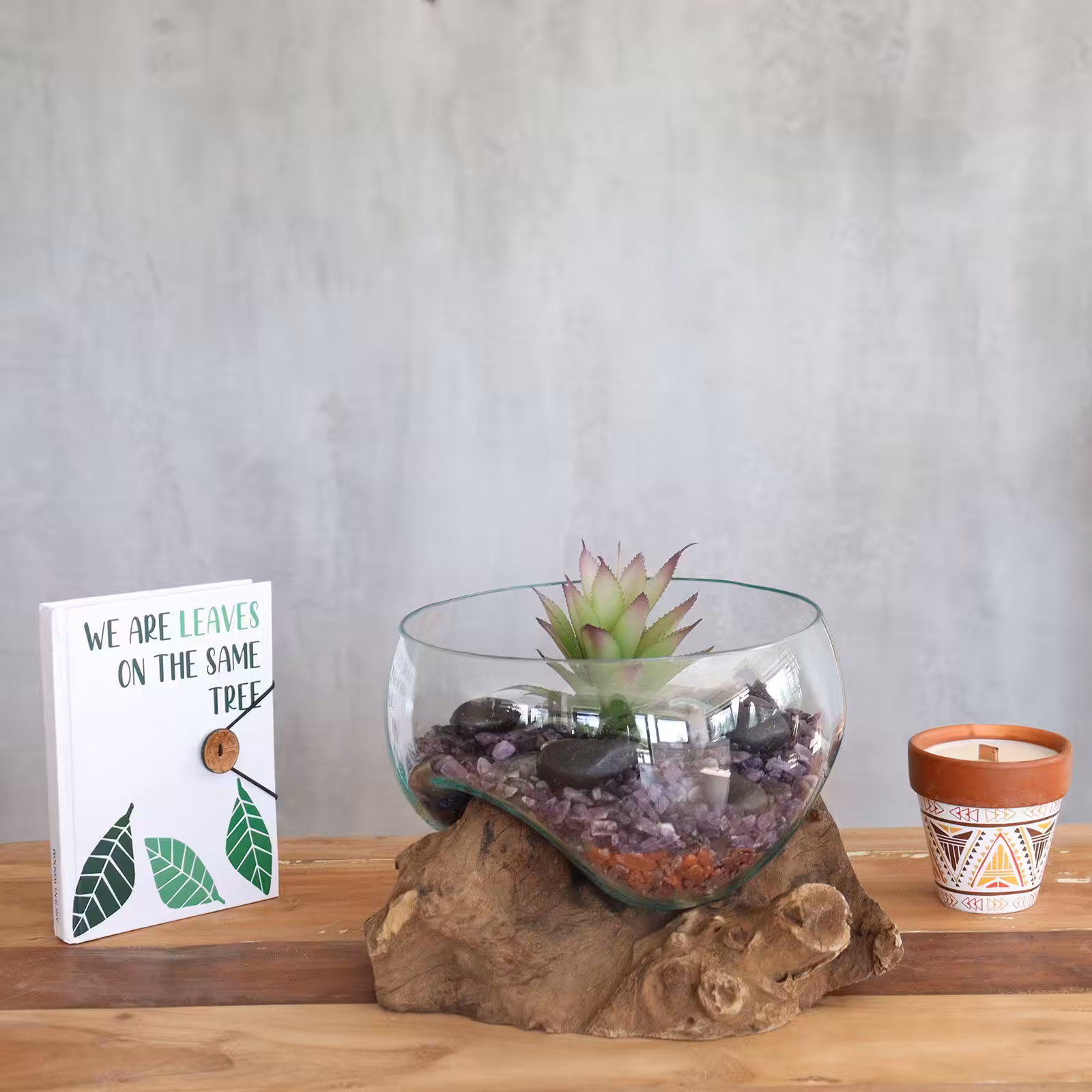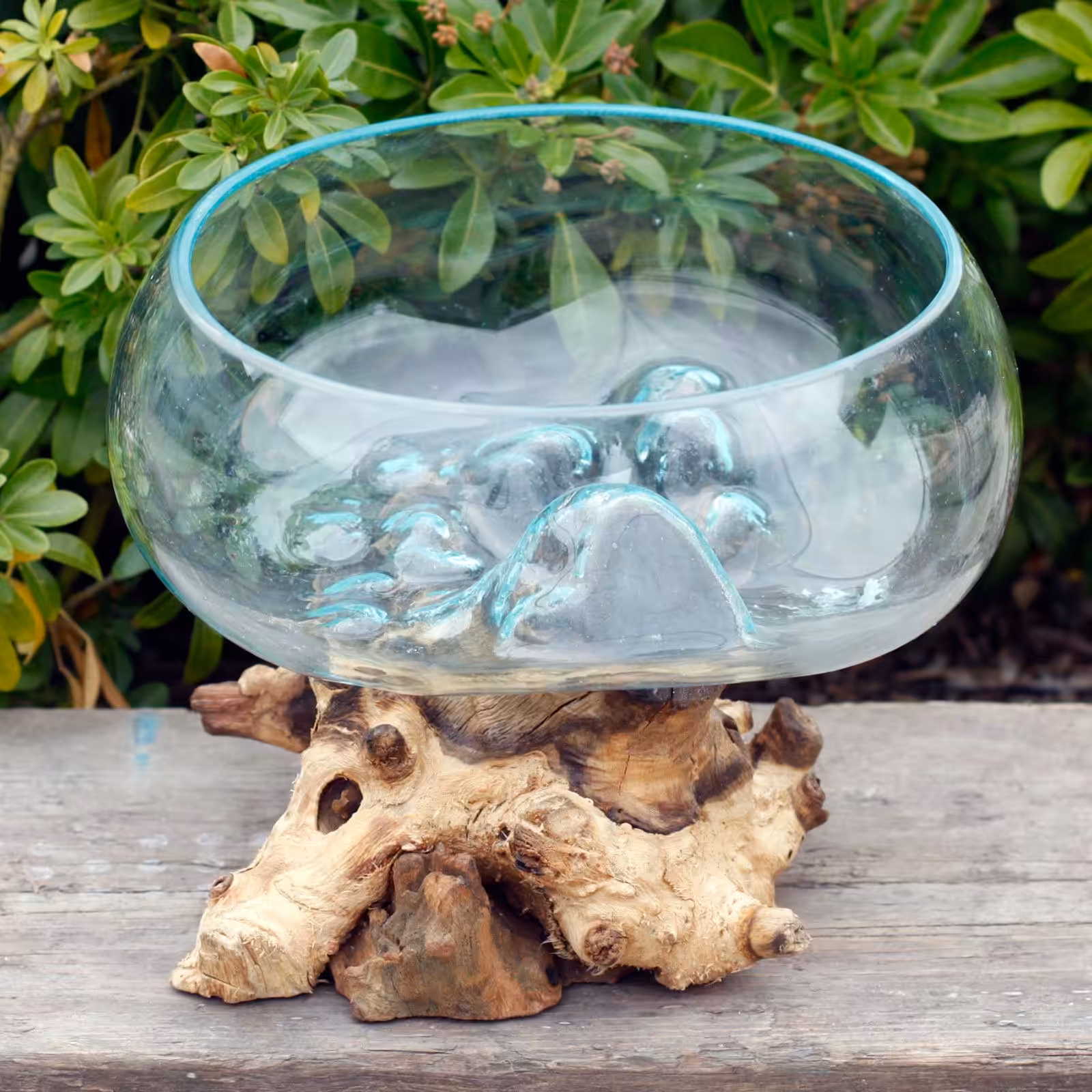 The glass is hand-blown and while still hot it is then relaxed over a piece of Gamal root, the glass then hardens to the shape of the wood ensuring a perfect fit. They are crafted using a natural product by using hand tools in the traditional Balinese way. It provides a one-of-a-kind setting for stones and air plants, cut flowers or a wine decanter.