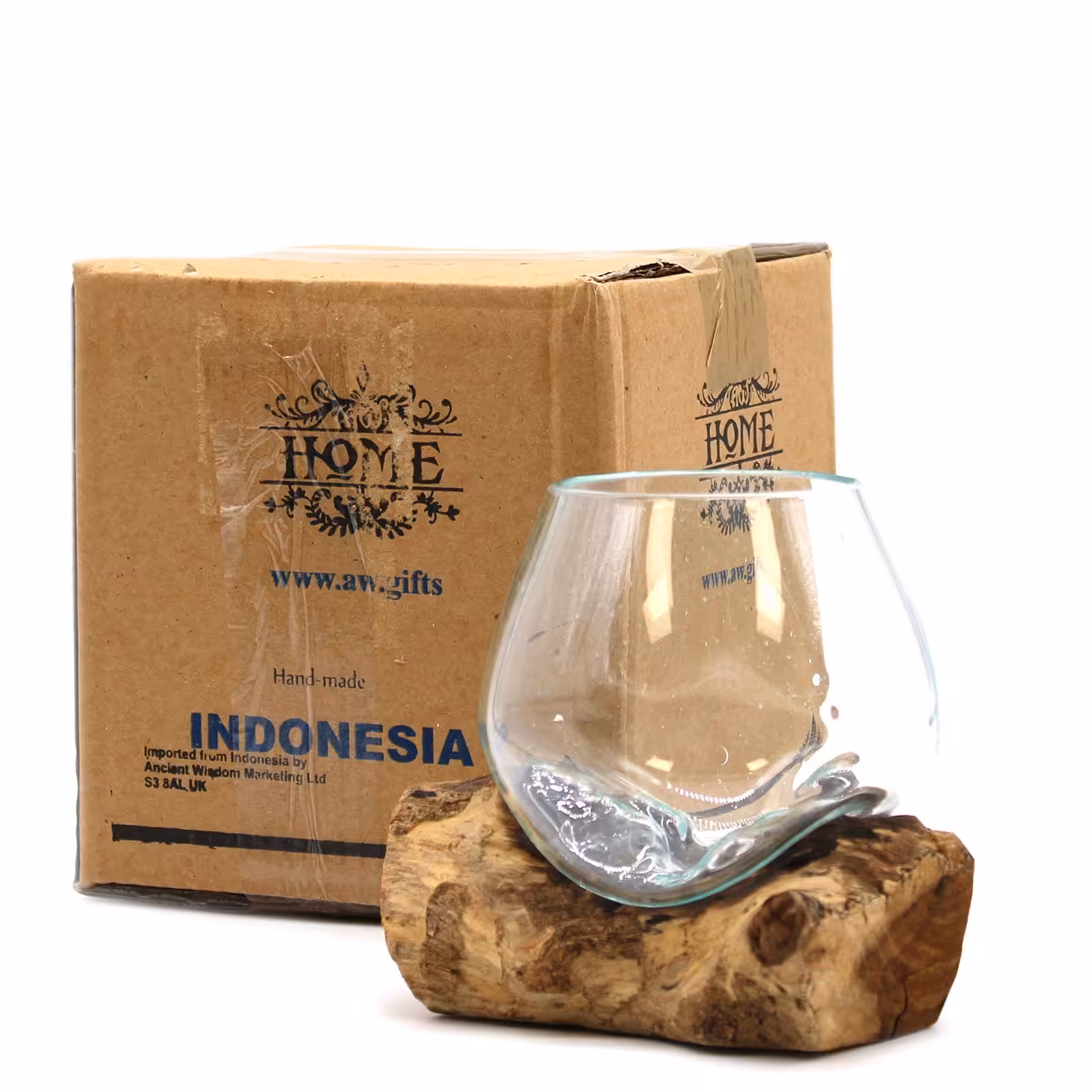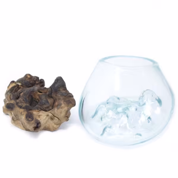 The glass is hand-blown and while still hot it is then relaxed over a piece of Gamal root, the glass then hardens to the shape of the wood ensuring a perfect fit. They are crafted using a natural product by using hand tools in the traditional Balinese way. It provides a one-of-a-kind setting for stones and air plants, cut flowers or a wine decanter.