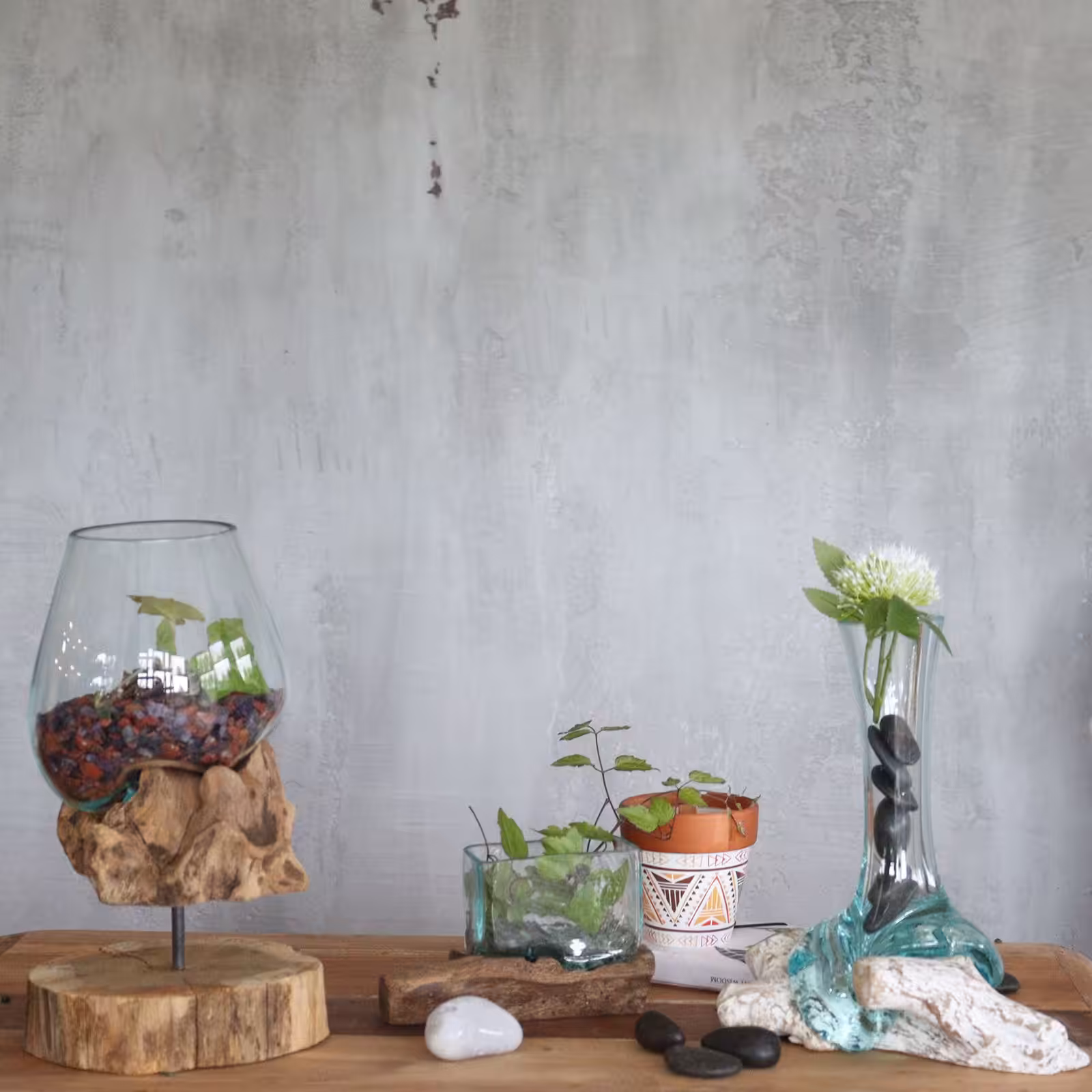 The glass is hand-blown and while still hot it is then relaxed over a piece of Gamal root, the glass then hardens to the shape of the wood ensuring a perfect fit. They are crafted using a natural product by using hand tools in the traditional Balinese way. It provides a one-of-a-kind setting for stones and air plants, cut flowers or a wine decanter.