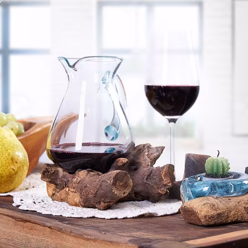 The glass is hand-blown and while still hot it is then relaxed over a piece of Gamal root, the glass then hardens to the shape of the wood ensuring a perfect fit. They are crafted using a natural product by using hand tools in the traditional Balinese way. It provides a one-of-a-kind setting for stones and air plants, cut flowers or a wine decanter.