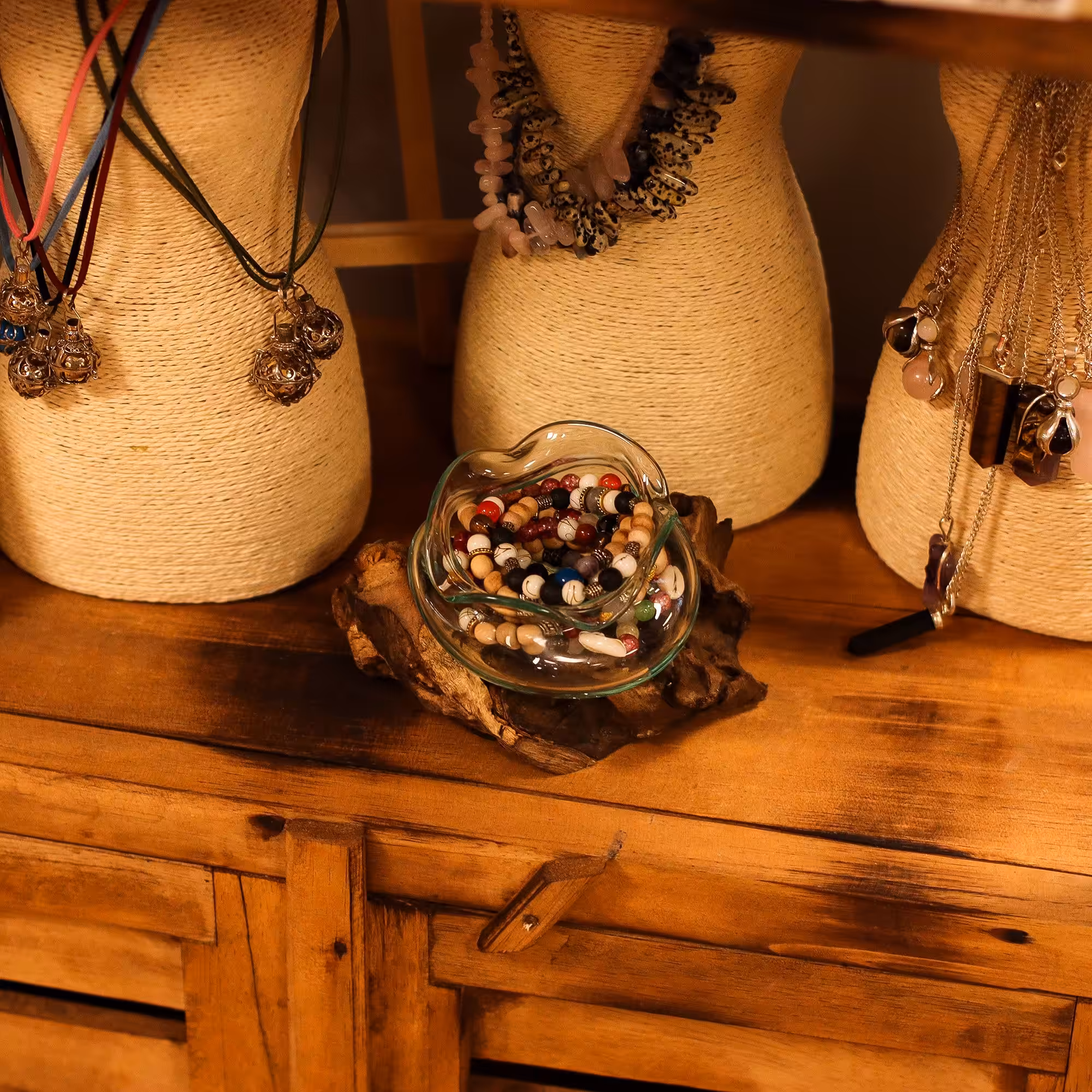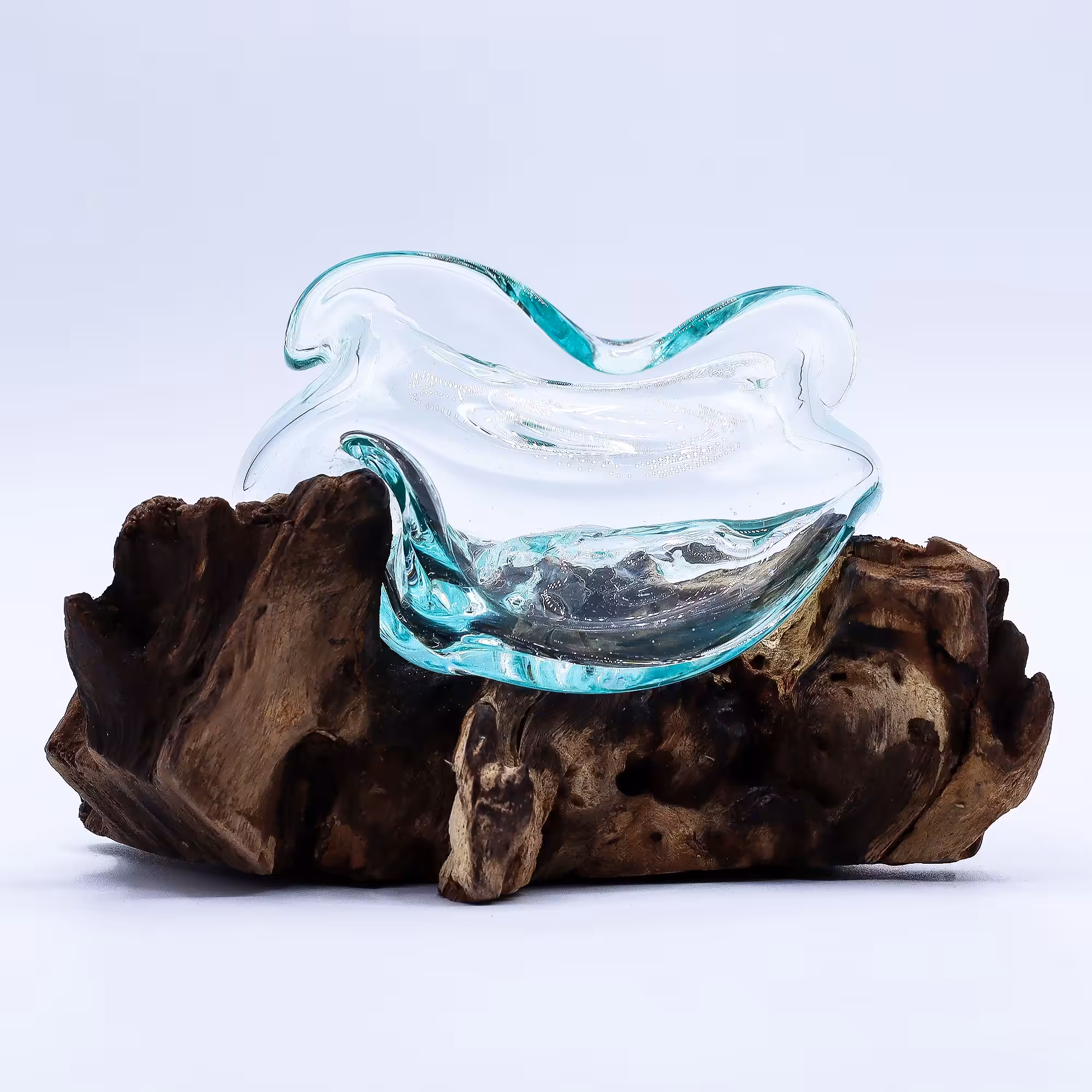 This molten glass wavy bowl rests beautifully on natural gamal wood, creating a fluidorganic piece that brings a touch of Bali-inspired calm into your home.