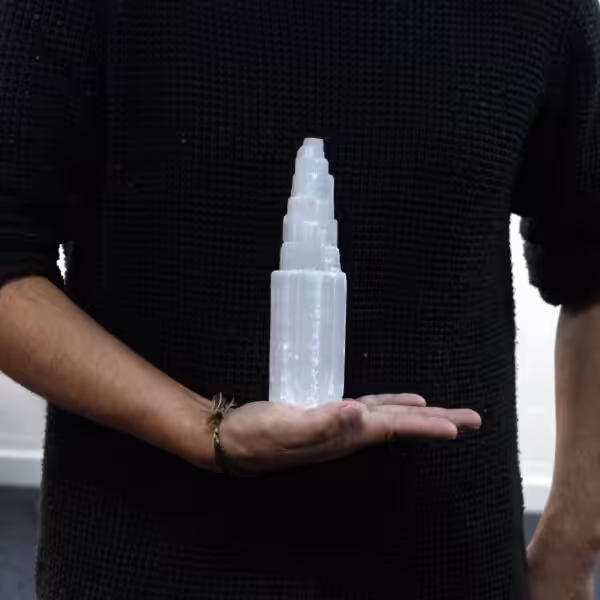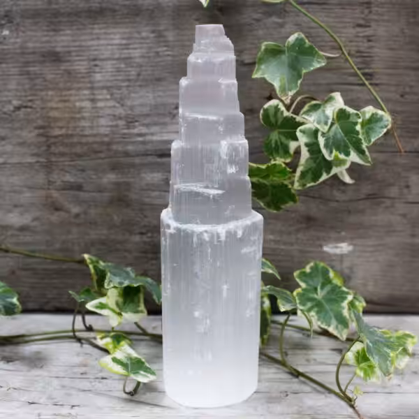 This beautiful Selenite Tower by Ancient Wisdom is from the mountains of Morocco. The crystal received its name from the Greek goddess of the moon: Selene. and you can see why.. the way the milky crystals refract light is totally lunar.