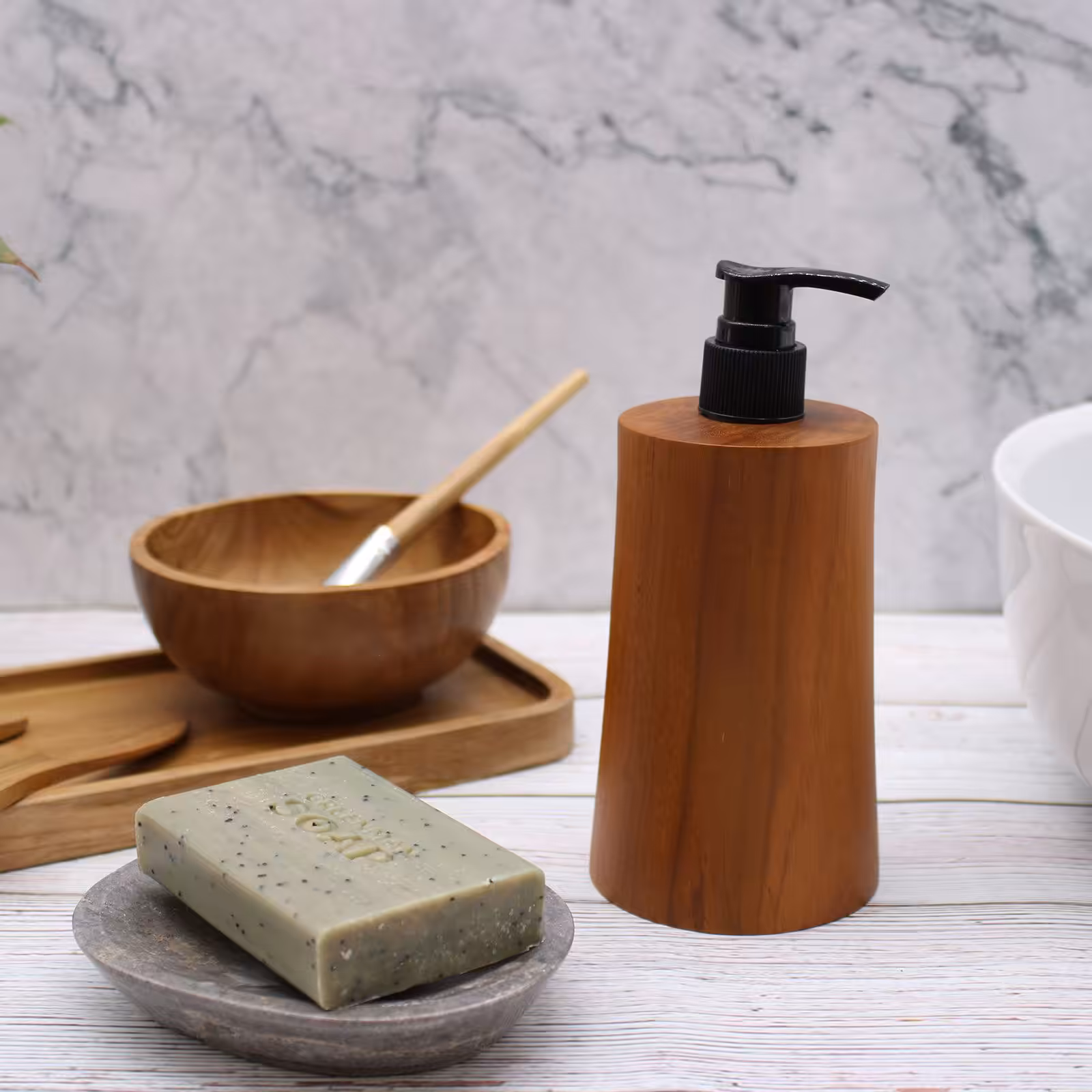 Elevate your customer’s home with these sleek and sophisticated teakwood soap dispensers. They are lovingly made in the heart of Java villages from carefully managed teak reserves With a little bit of care, these soap dispensers will serve your customers for years. This soap dispenser has a sturdy pump. This reusable soap dispenser has a capacity of 200 ml. The pump and bottle inside that hold liquid soaps is made of plastic.