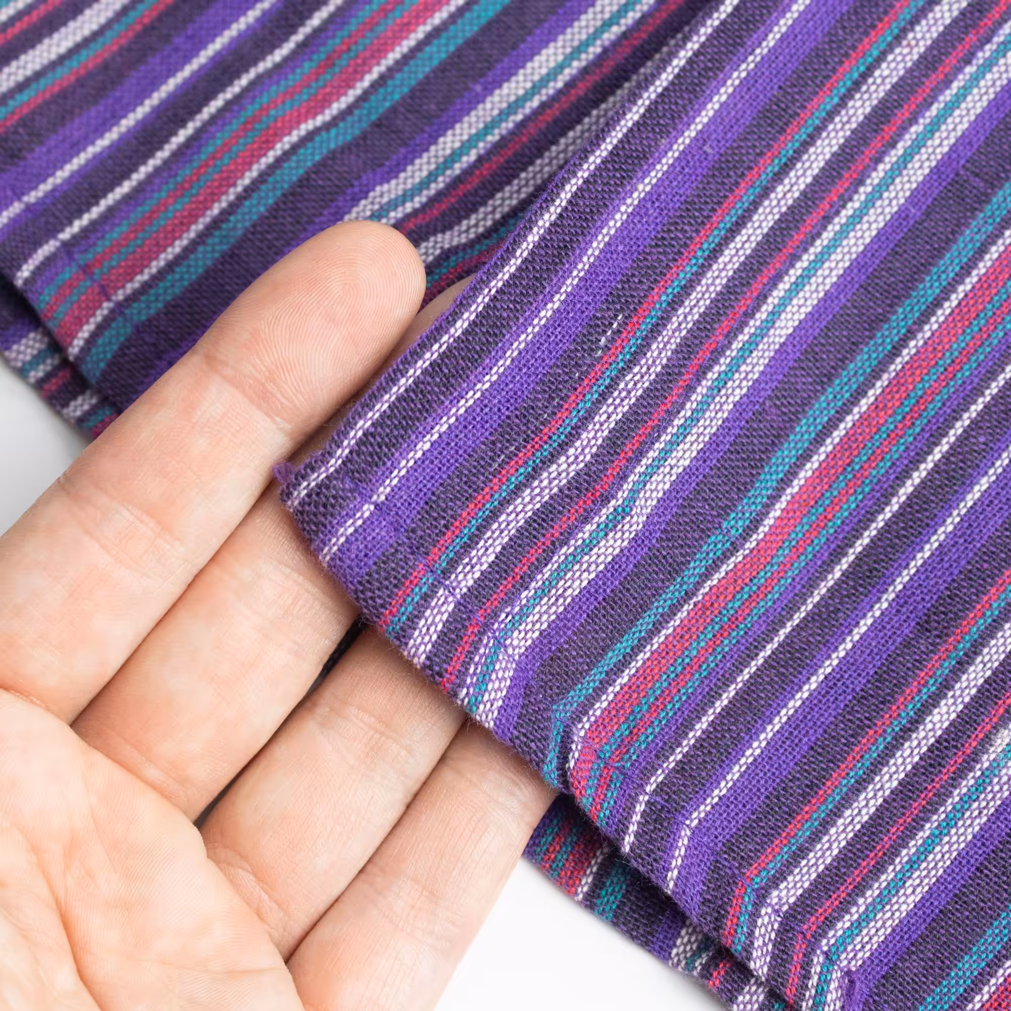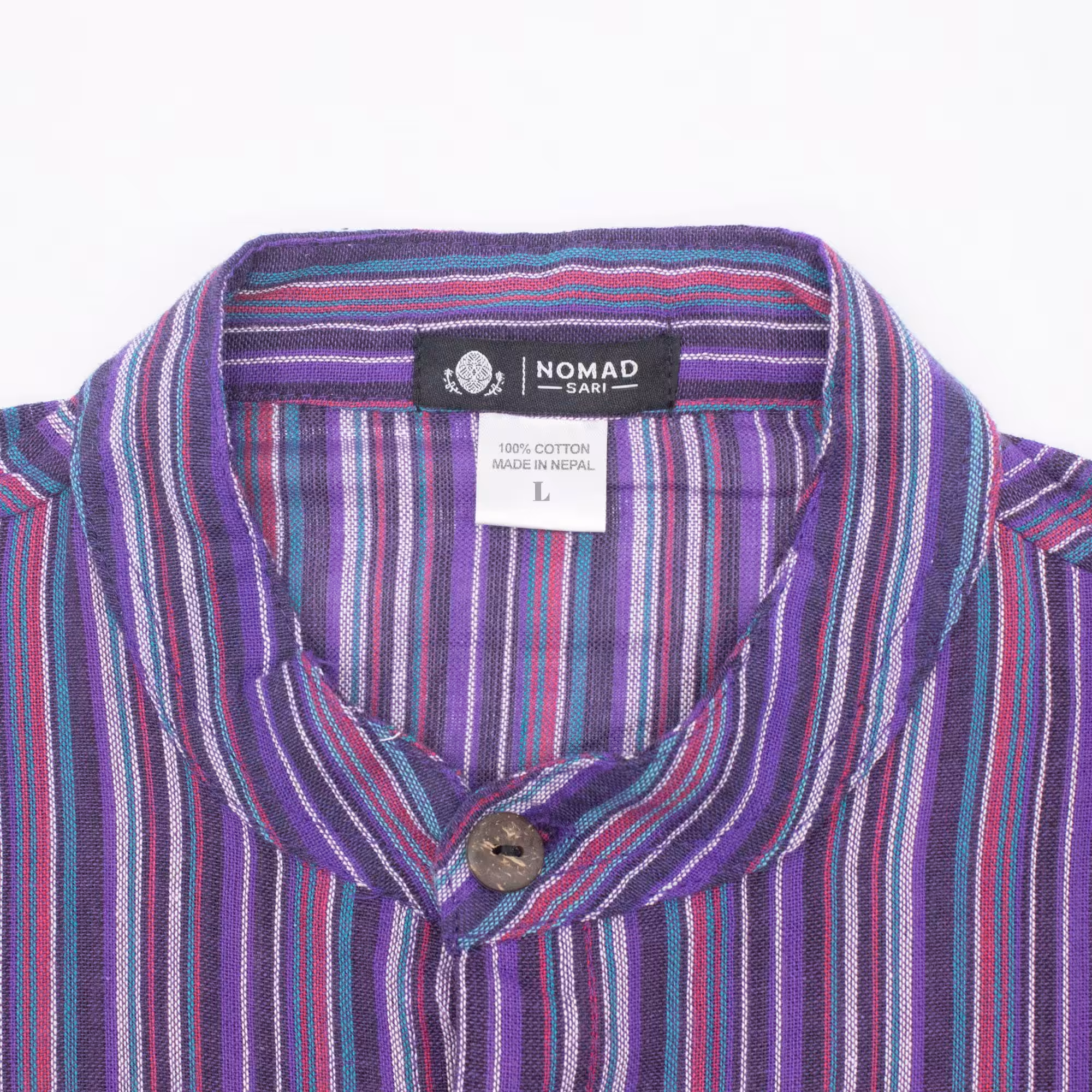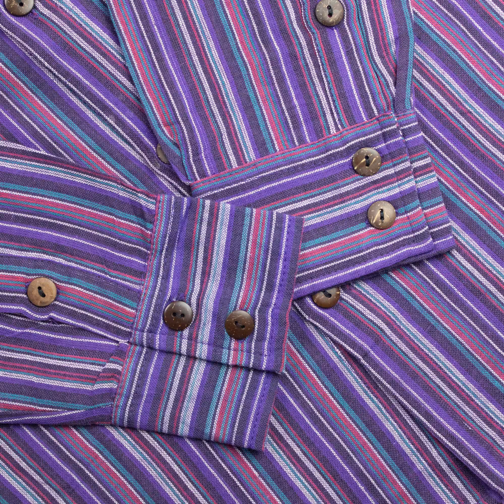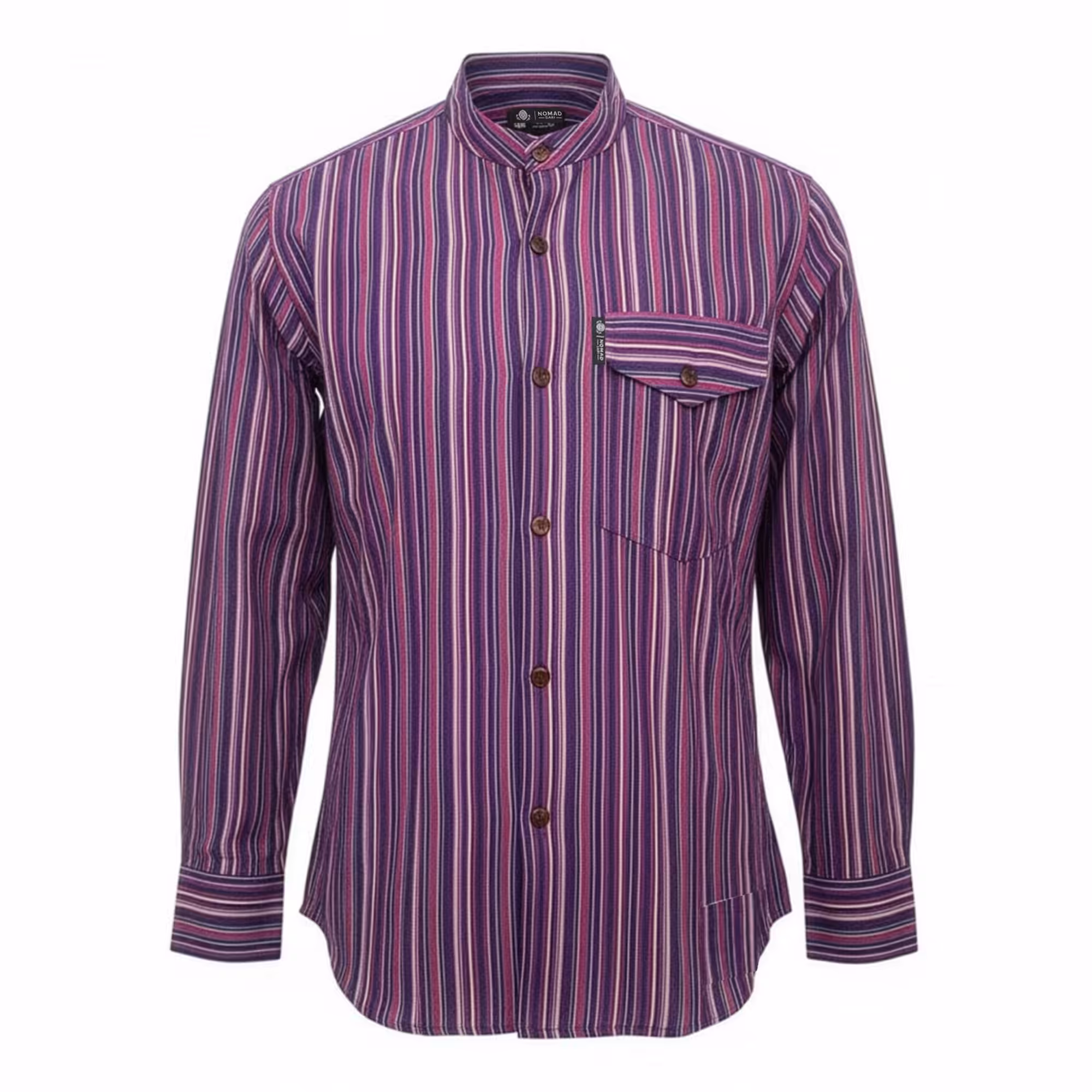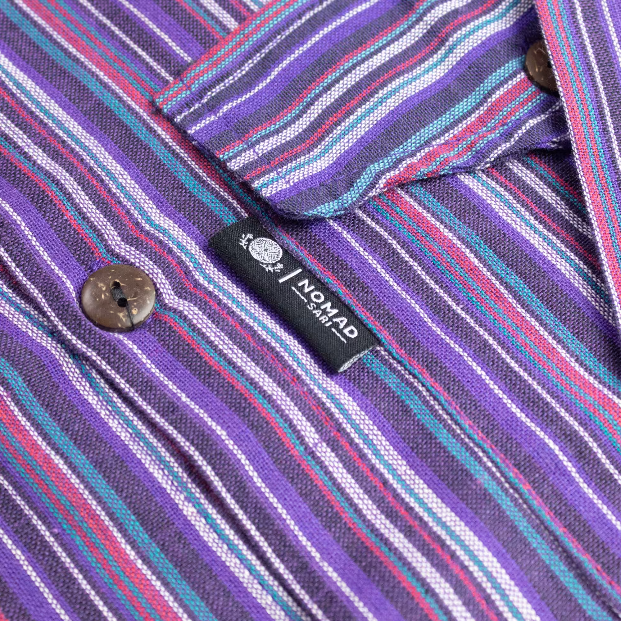 The Nomad Sari Grandad Shirt in Black Purple combines classic striped fabric with a relaxed grandad-style design. The deep purple tones create a distinctive look while remaining easy to pair with jeans, trousers, or layered outfits.
