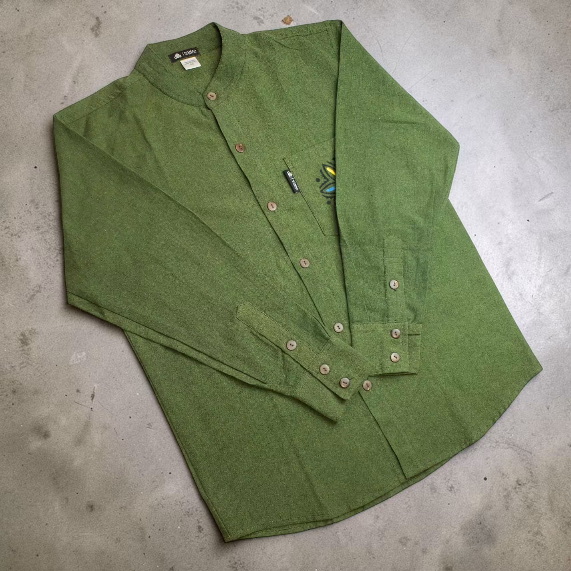 The Nomad Sari Kathmandu Shirt in Forest Green features a classic collarless style with a hand-painted pocket detail that adds subtle personality. The earthy green colour gives the shirt a relaxed, natural feel suited to everyday styling.