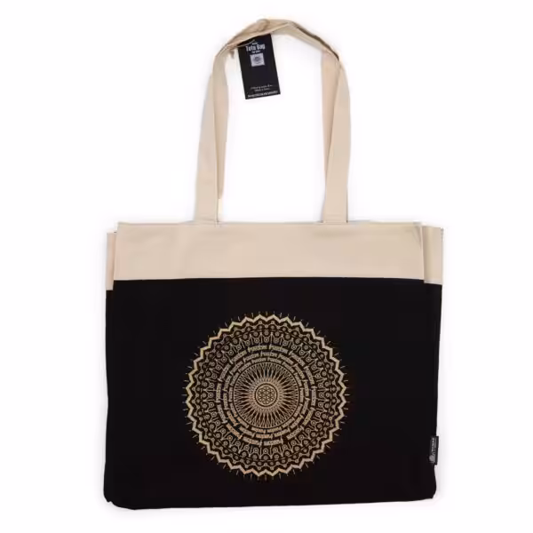 This spacious tote bag showcases a detailed Mandala Wheel print in gold, inspired by traditional Sanskrit art. The mandala is a sacred geometric symbol found in various cultures, representing wholeness, continuity and the cyclical nature of life. In spiritual traditions, it’s used as a meditation aid to help centre the mind and find peace.