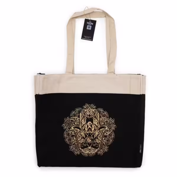 38 x 15 x 43 cm | 14oz Cotton | Handmade in IndiaFeaturing the mystical Hamsa Hand, this oversized tote bag blends protective symbolism with artisan craftsmanship. The Hamsa, recognised across various traditions including Middle Eastern and Indian cultures, is believed to protect against negative energy and bring blessings, luck and strength.