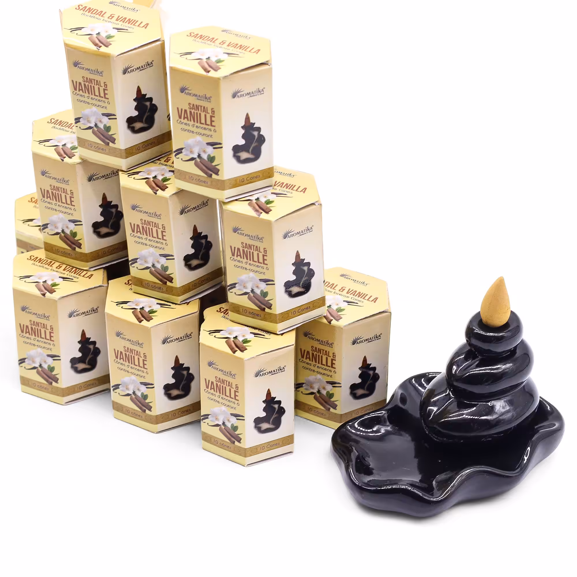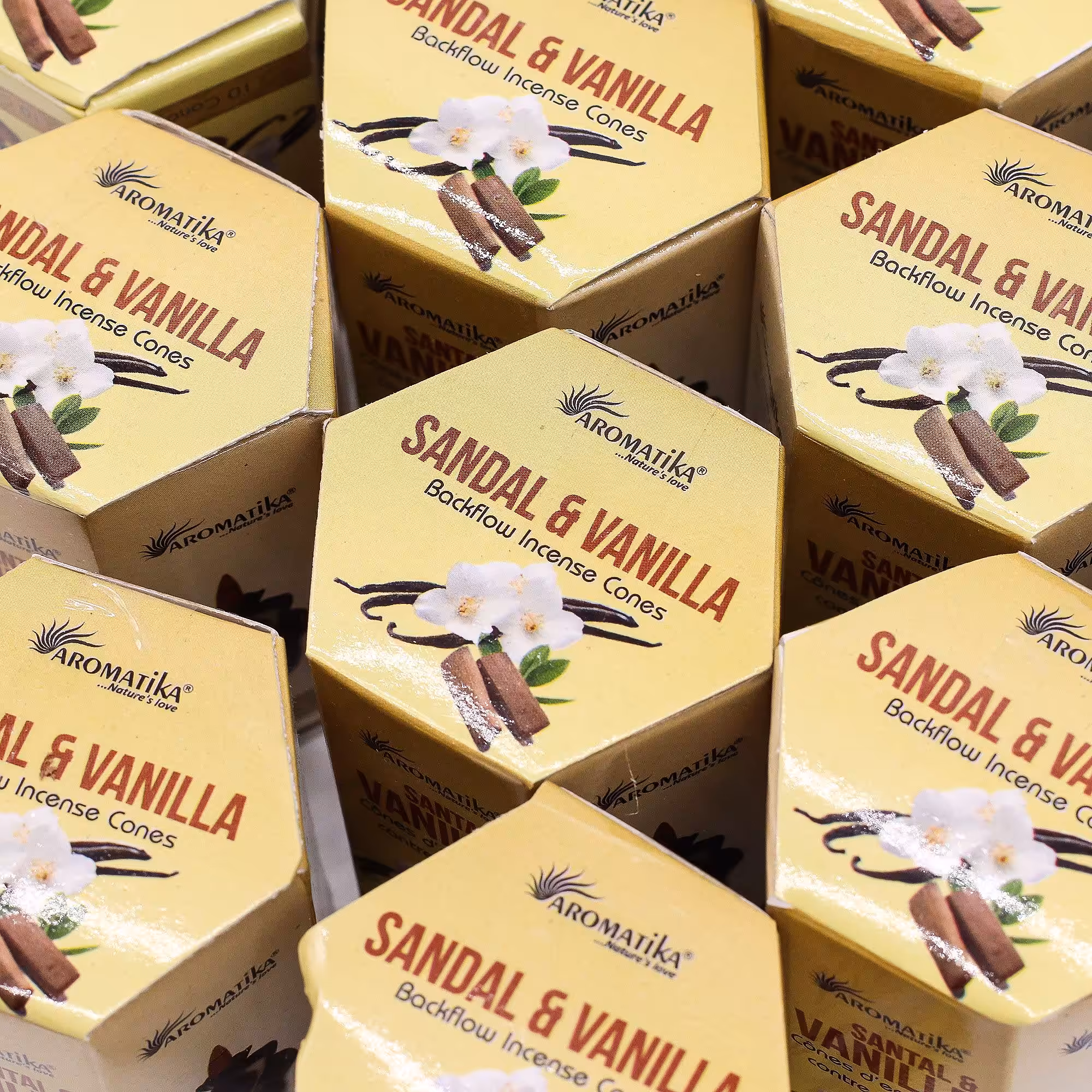 Indulge in the harmonious aroma with our Aromatika Masala Backflow Incense – Sandalwood & Vanilla. Each uniquely designed hexagon-shaped box contains 10 backflow incense cones. This exquisite combination creates a calming and comforting sensory experience.